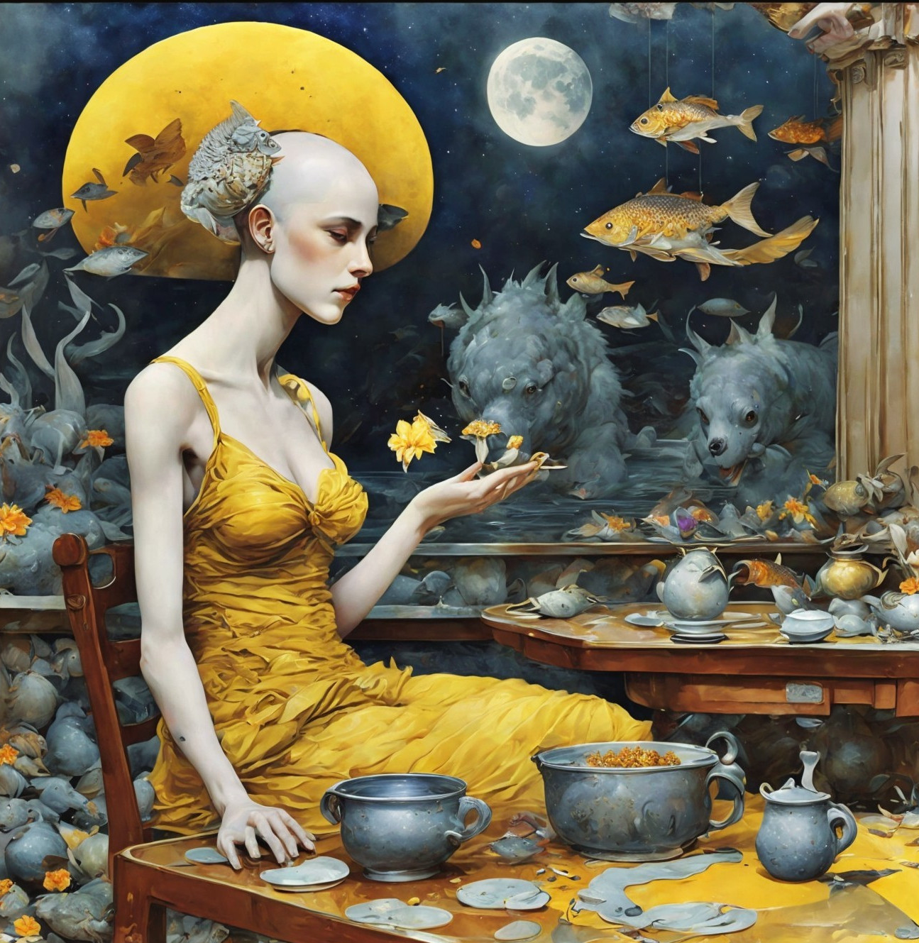 A surreal painting of a woman in a yellow dress at a table, surrounded by floating fish, wolves, and planetary bodies against a starry backdrop.