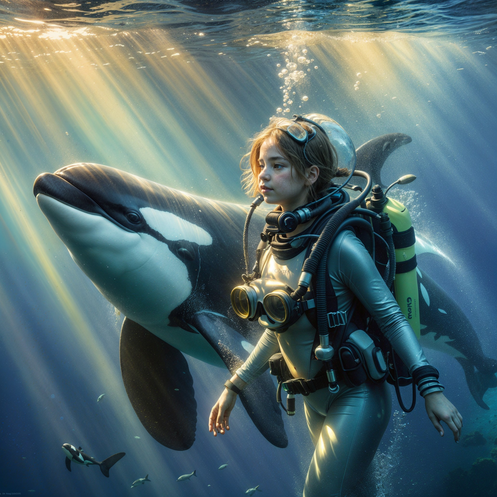 Prompt: Young girl with scuba gear, lost in thought, swims alongside a majestic orca, their playful interaction conveyed through gentle body language. Soft, ethereal beams of sunlight filter down from above, casting a serene ambiance throughout the scene. The palette is dominated by deep blues and vibrant greens, with warm hints of sunlight gold dancing across the waves. The sharp focus is drawn to the expressions of both the girl and the orca, their emotions reflected in the shimmering bubbles that rise to the surface, adding depth and texture to the composition. Inspired by the works of Ash Thorp, Simon Stalenhag, and Loish, the image is rendered in stunning 8k detail, with natural lighting and a shallow depth of field that blurs the surrounding water, emphasizing the connection and movement between the girl and the orca, captured at a slight upward angle to convey a sense of wonder and freedom.