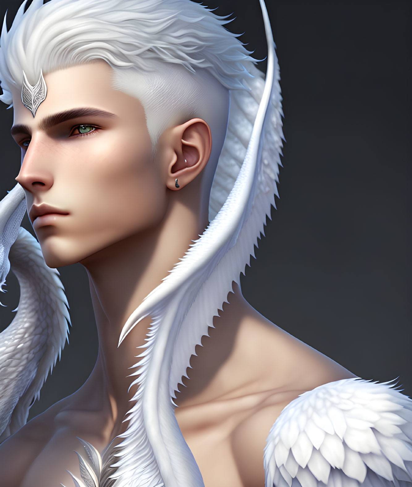 + Prompt:a young male 13 year hybrid of a white dragon and a human. face should be close to human as well as body shape. .. Long white tail and white scales