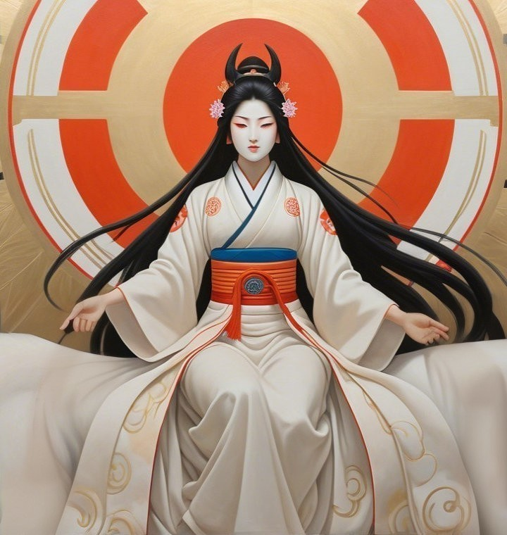 The image features a serene woman in a traditional kimono, sitting gracefully. Her long black hair flows, adorned with flowers, against a striking red and gold background, evoking a sense of presence.