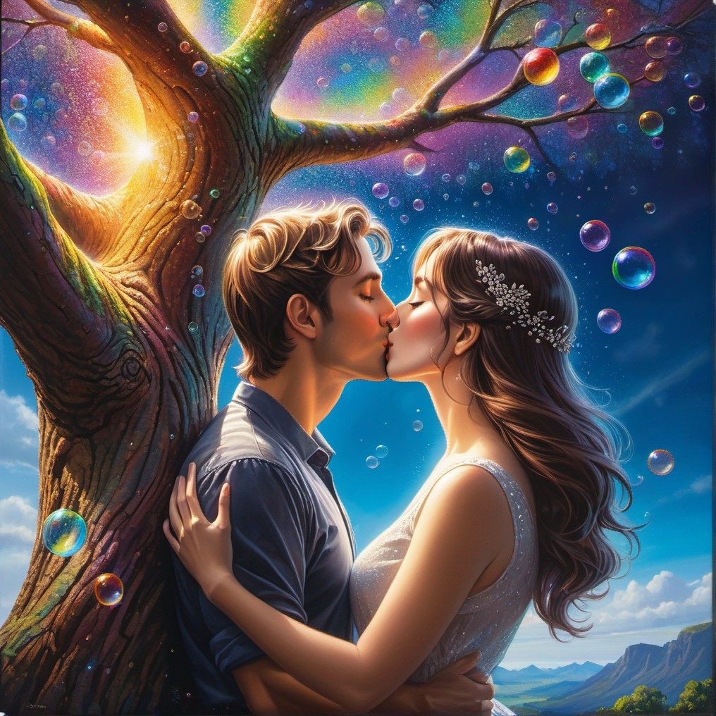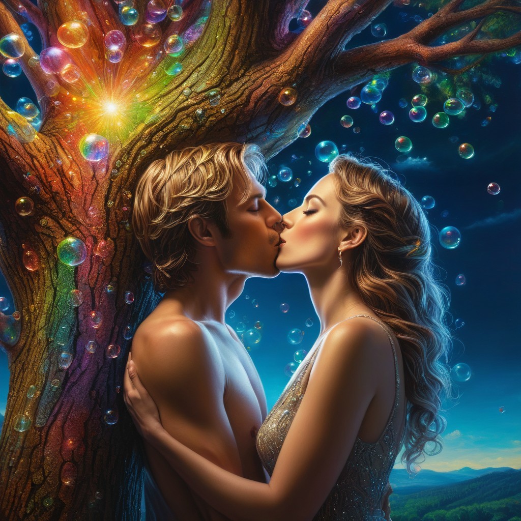 A fantasy image of a woman and a man engage in a kiss. They form the trunk of a tree.