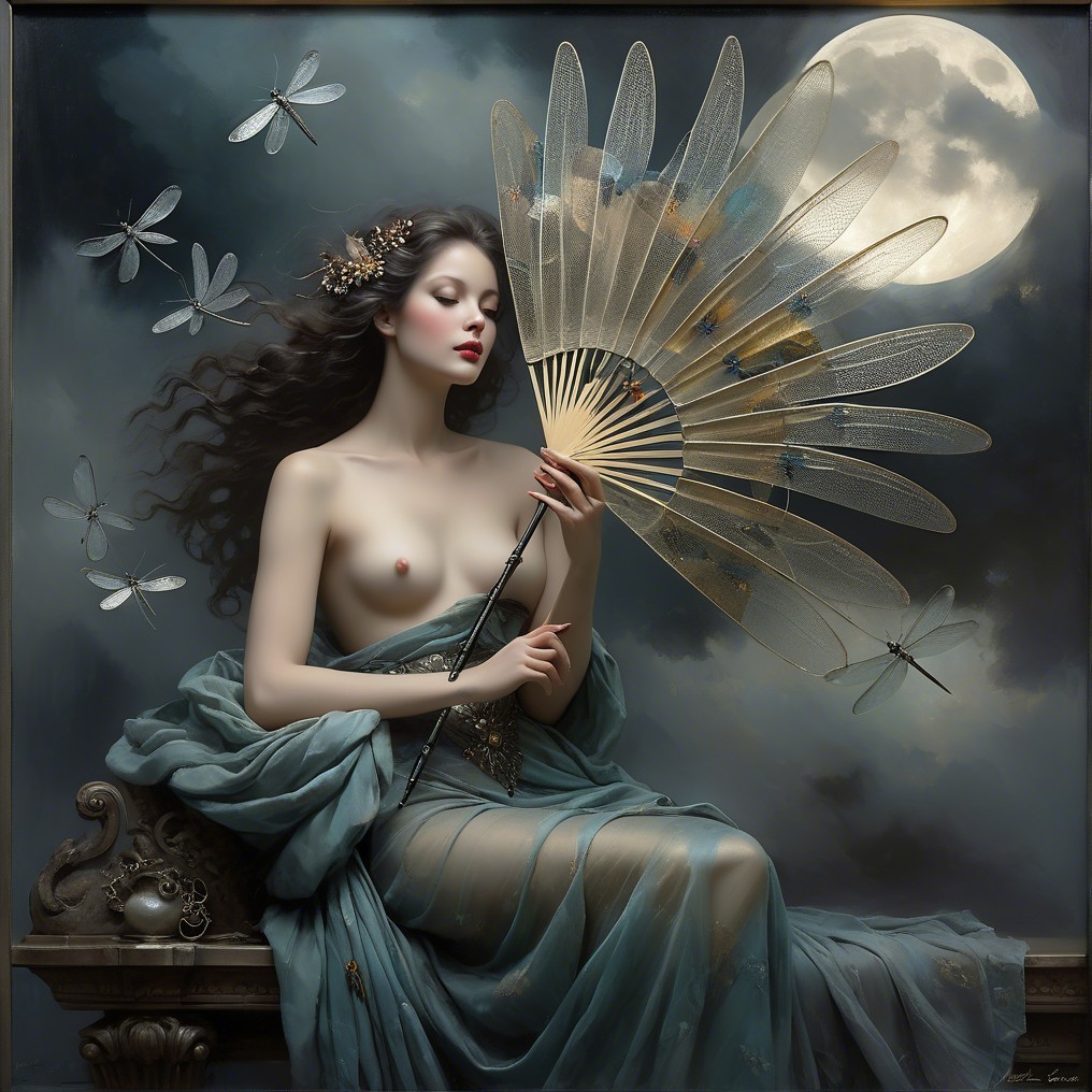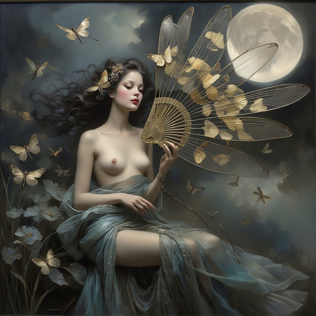 A serene woman in a flowing blue gown holds a delicate fan, surrounded by dragonflies against a moody, moonlit backdrop, exuding elegance and tranquility.