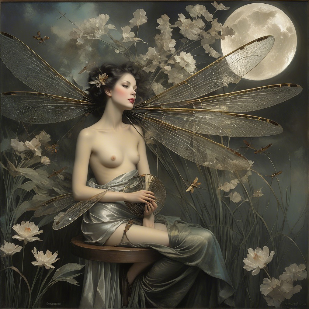 + Prompt:beautiful woman holding a fan made from dragonflies. Mysterious woman Surreal dream in the style of pino daeni. Magical nostalgia, glory, Mercury Glass patina, light and gossamer haze, topographic lines, Art Brut, moody, somber, desaturated colors. In the style of John Rogers cox . This artwork amalgamates the artistic styles of Michael Parkes,