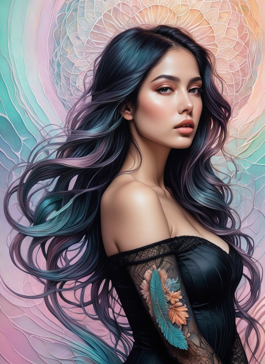 + Prompt:Mesmerizing surreal female portraiture with intricate details, focusing on the upper body, grungy aesthetic, Juminocore influence, featuring iridescent and flowing oily line work. Embrace a psychosomatic surrealism style inspired by Gayane Khachaturian with a pastel color palette reminiscent of Ernst Haeckel's work. Utilize pen and ink to create impossible light transitions, incorporating liminal and 3D effects with brushstrokes akin to Frank Frazetta's technique. Craft an oil painting with an airbrush-like finish, enriched with vibrant boho decor-styled burnt orange and dark yellow hues. Infuse the artwork with bold, abstract elements to enhance a cozy and reflective atmosphere, focusing on rich textures and smooth blended tones.