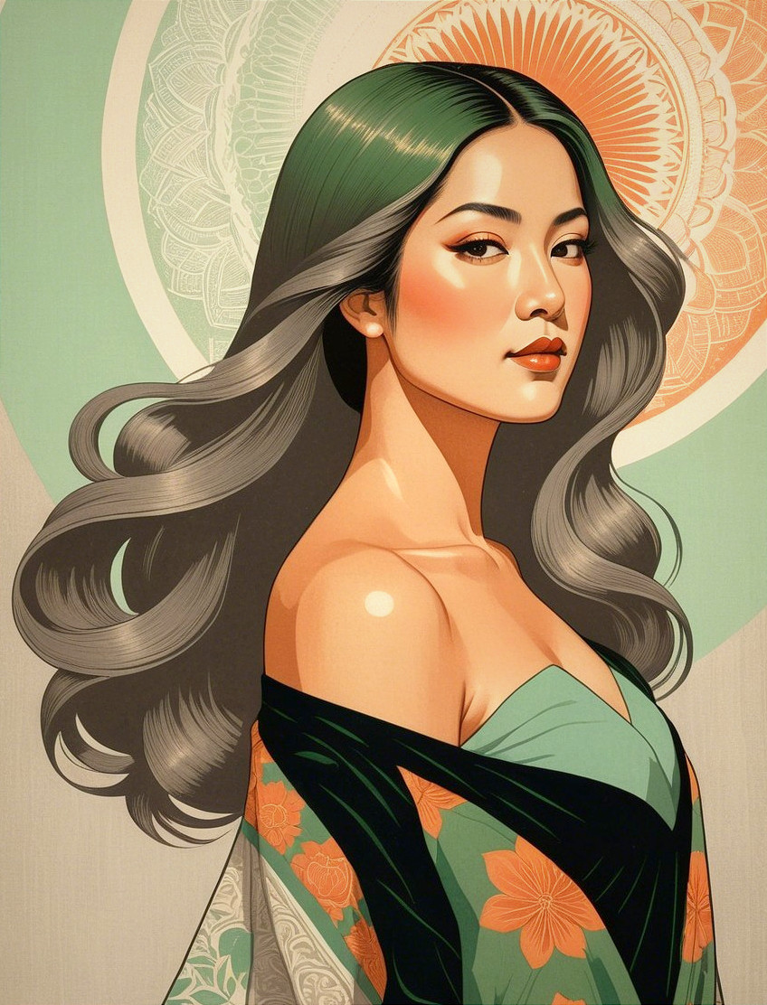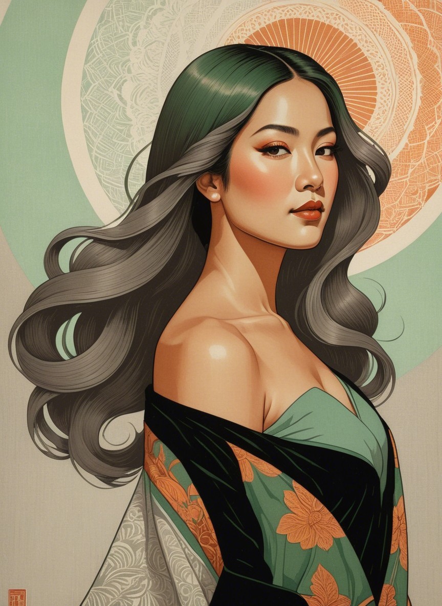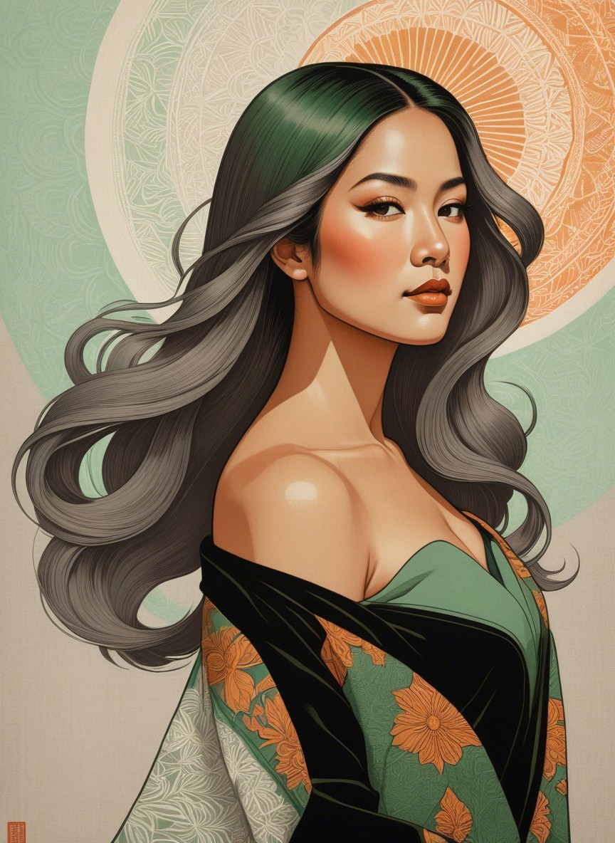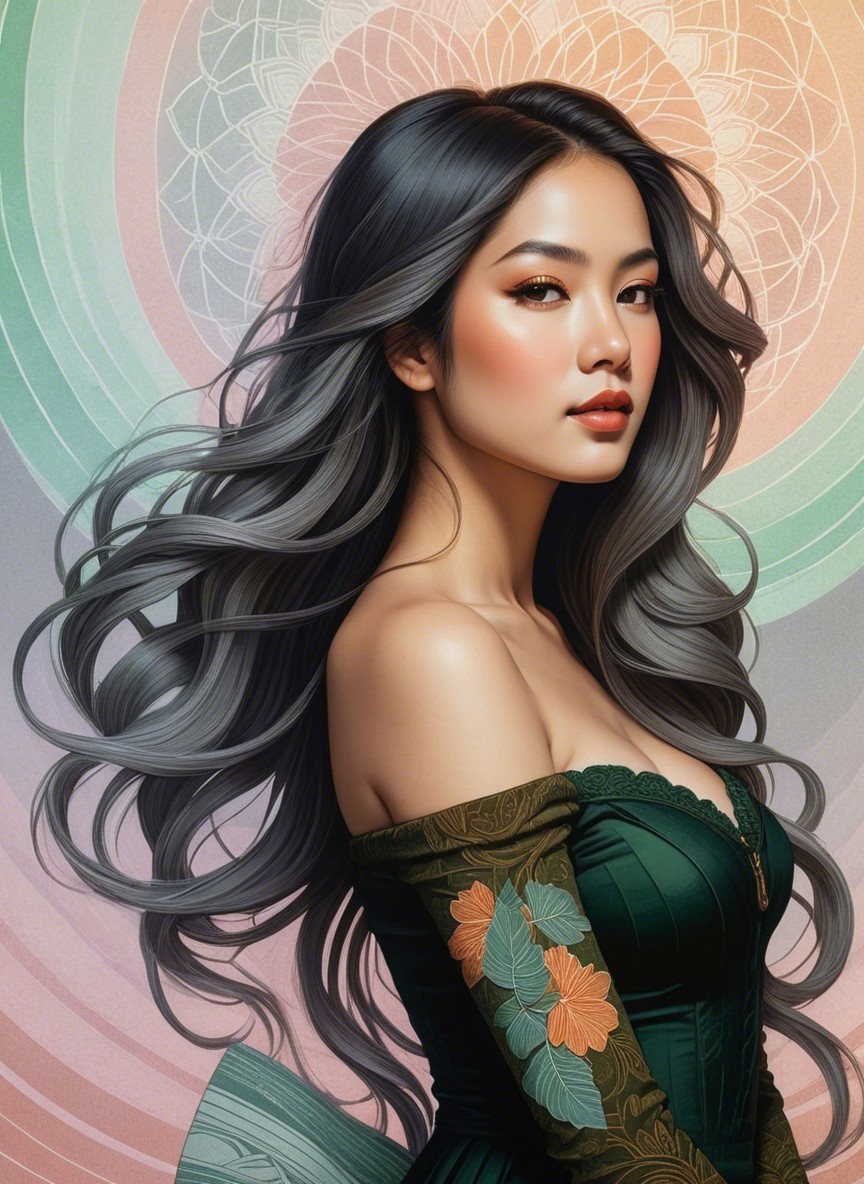Prompt: An eccentric female portraiture showcasing a diverse range of styles, cel-shaded, stippled, tesselated hair, symmetrical, lineage details, flat image, plain strokes. Enchanting Woodblock Print. The artwork features a warm color palette with light grays, brown-green, and sienna hues, accented by primary colors. It exudes an ethereal and atmospheric vibe with subtle tonal depth, scale, and intricate intaglio printmaking techniques Mesmerizing surreal female portraiture with intricate details, stylized with micro-pen lines, warm and rich color palette with earthy tones, layered textures, fragmented painterly style with heavy brushstrokes by Brandon Mably, hand-drawn illustration style, irregular strokes, blotting,mythical, lens flares. Added naive shockwaves in colour foiling. extravagant peeling layers .Pastel colors transition into a misty baby-blue void adds a touch of magic to the composition, enriching it with psychosomatic undertones,headshot, precise Gelsculpt 64K rendering, cel-shaded drawing style, novelty architecture, dof, bokeh, debeh, focusing on the upper body, grungy aesthetic, Juminocore influence, iridescent and flowing oily line work for a psychosomatic surrealism style inspired by Gayane Khachaturian with a pastel color palette reminiscent of Ernst Haeckel's work. Utilize pen and ink to create impossible light transitions, liminal, 3D effects with brushstrokes akin to Frank Frazetta's technique, airbrush-like finish, enriched with vibrant boho decor-styled burnt orange and dark yellow hues, stylized portrait, styles by Eduardo Paolozzi and Tai-Shan Shierenberg and Renny Tait, linocut, plasticity 1.6, collagraphy, high plasticity, stylized portrait with a juvenile essence. whimsical watercolor and ink paint in tiny outlines, reminiscent of woodcut-inspired graphics, surreal fissured hues in a plique-à-jour technique, stylized architectural background with warm toned fractal effects,