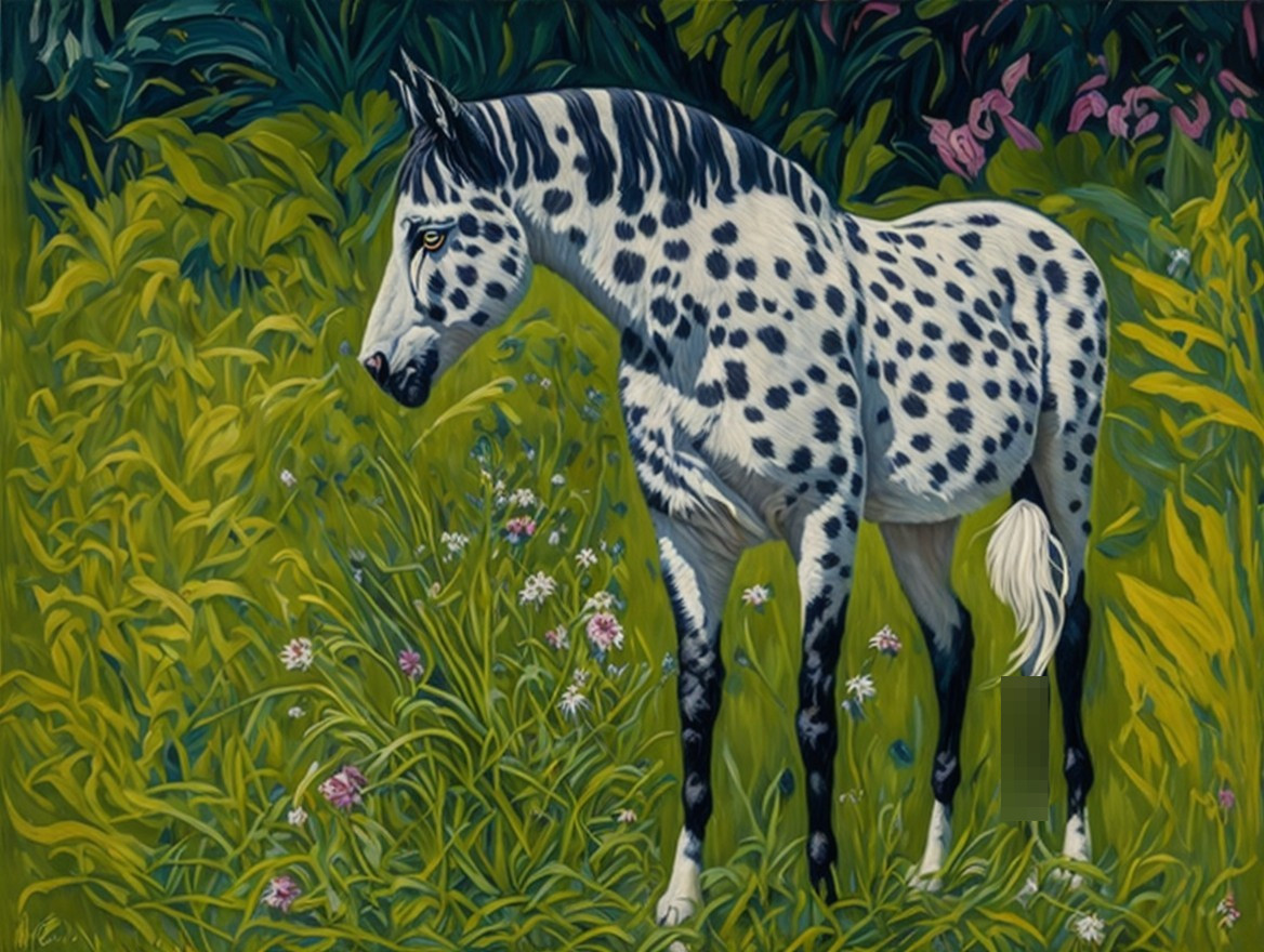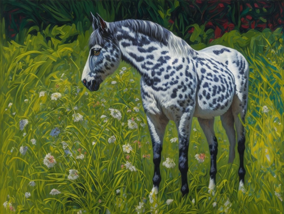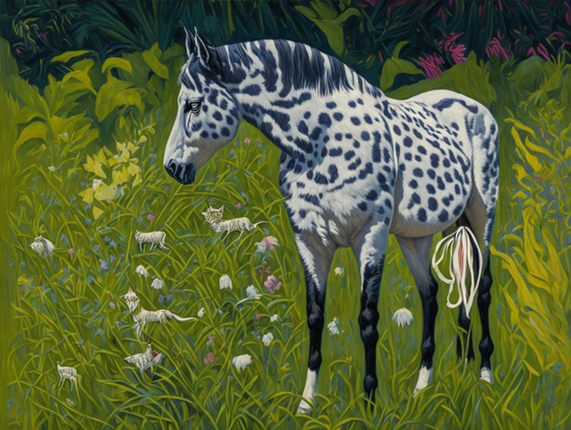 A vibrant, stylized painting of a horse with a unique spotted coat, standing gracefully in lush greenery filled with colorful flowers, showcasing a striking contrast with its surroundings.
