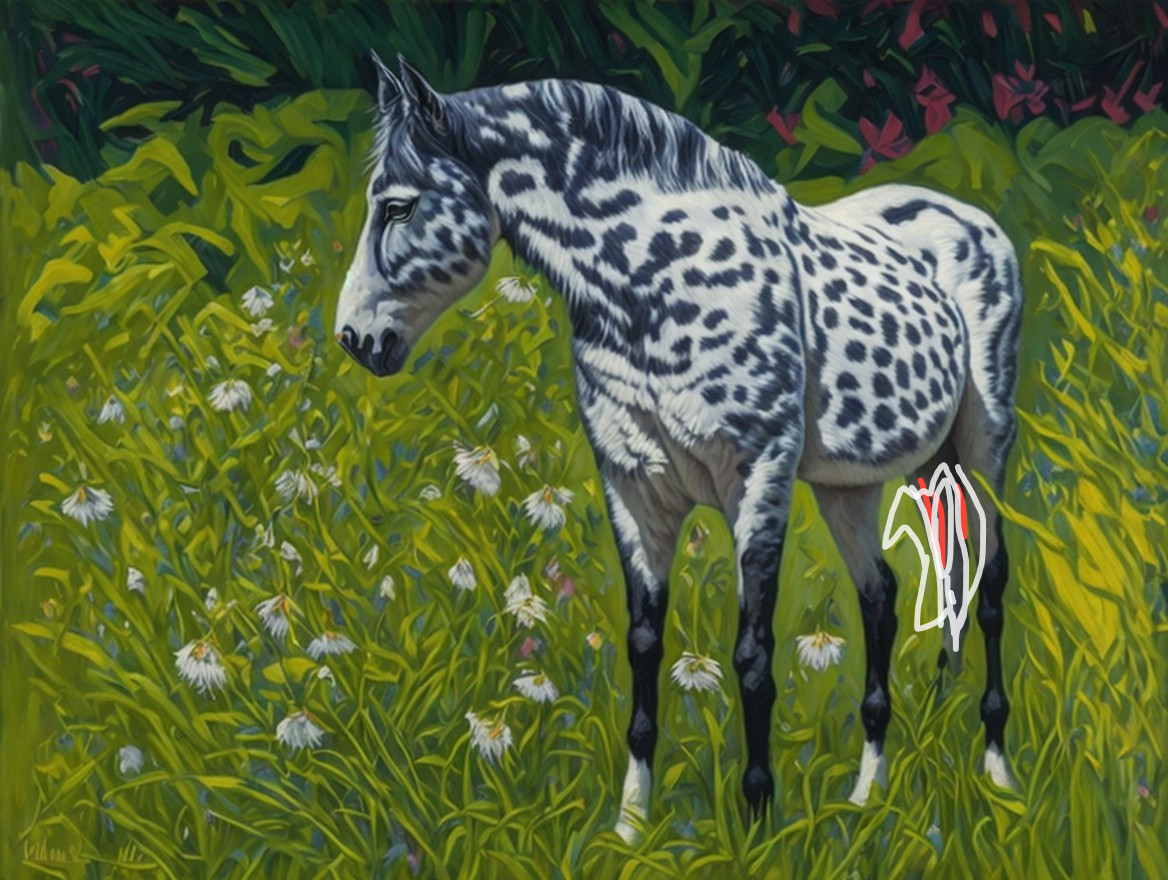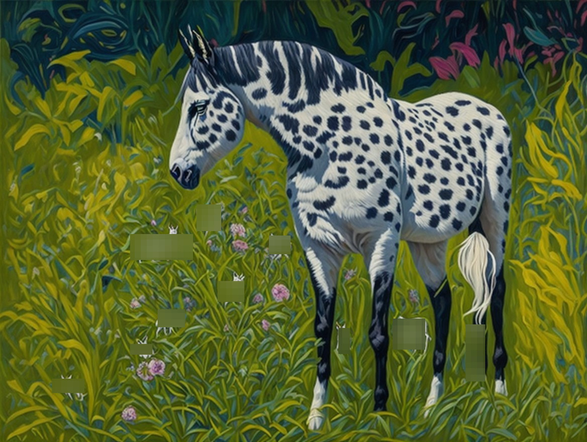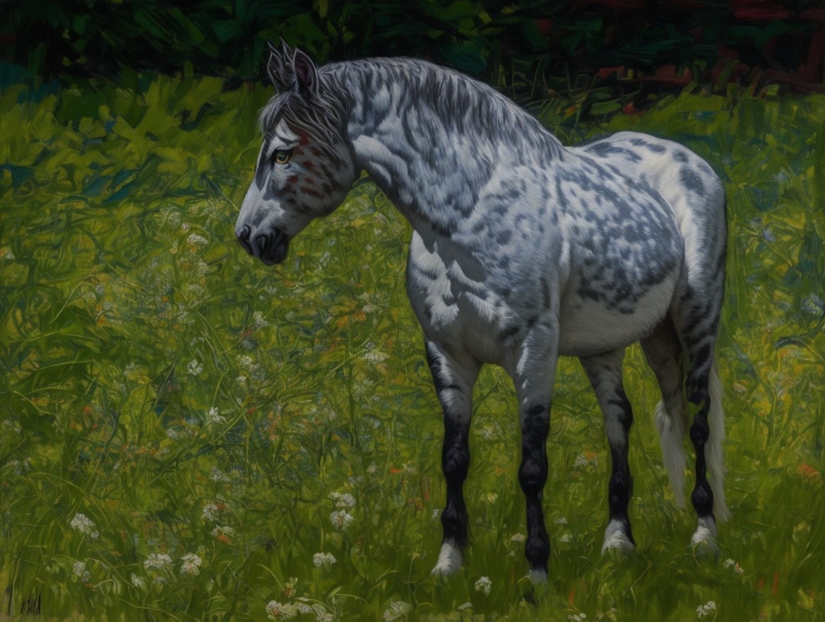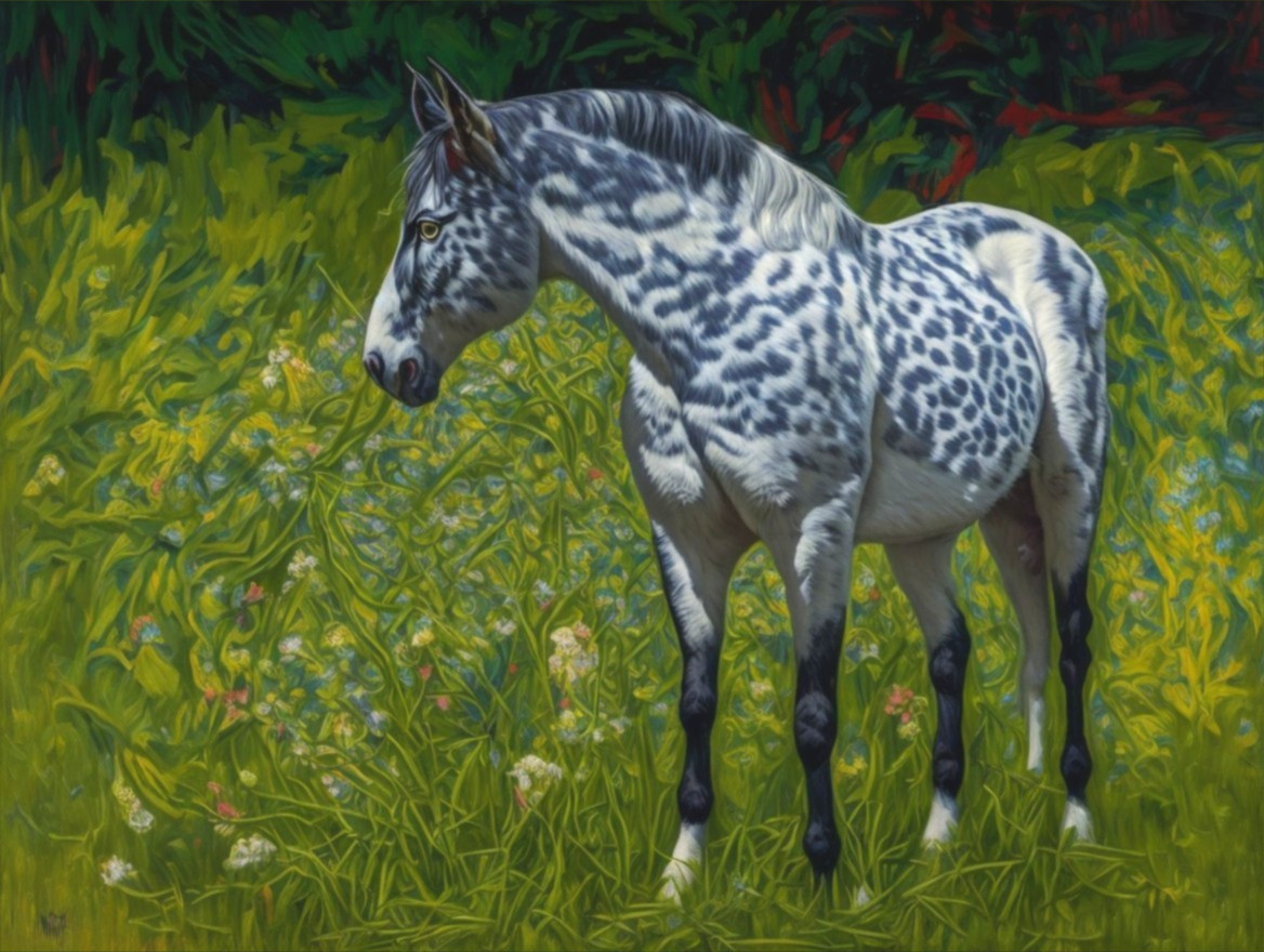 A vibrant, stylized painting of a horse with a unique spotted coat, standing gracefully in lush greenery filled with colorful flowers, showcasing a striking contrast with its surroundings.