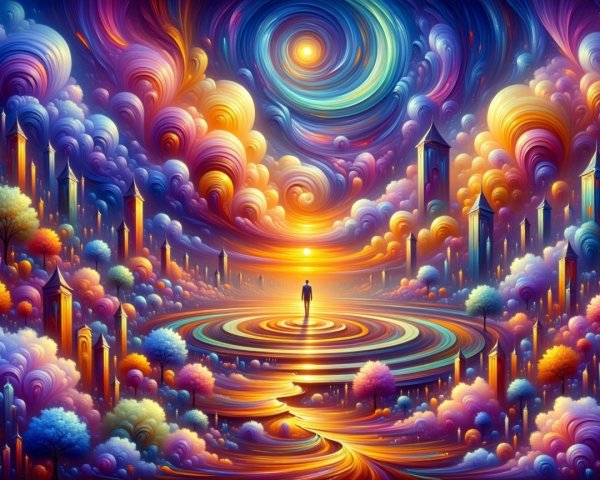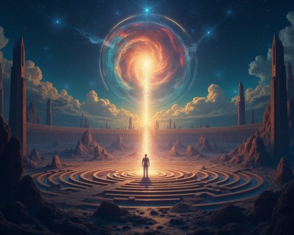 A surreal composition featuring a human-like face intertwined with abstract elements, cosmic textures, and vivid colors. Eyes glow with energy amidst swirling clouds and intricate patterns.