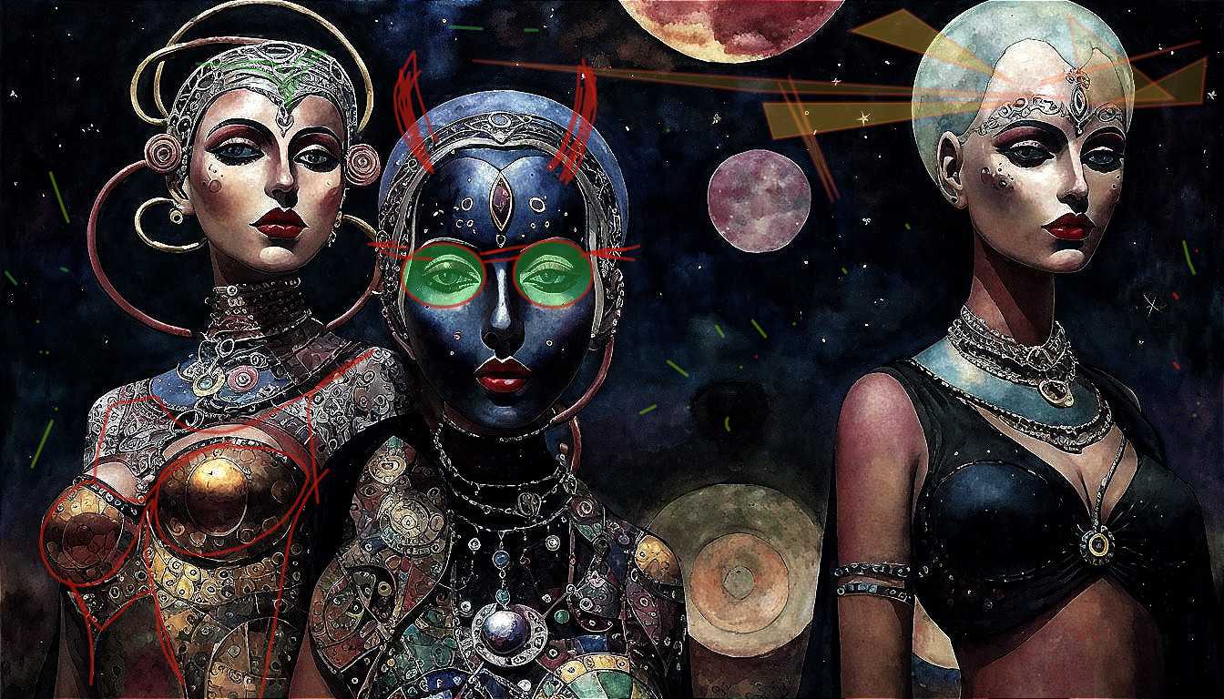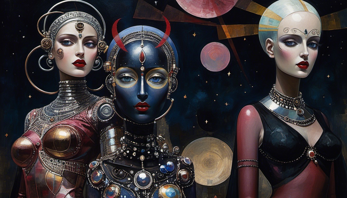 Three futuristic mannequins stand side by side, adorned with intricate metallic designs and bold accessories. Their striking makeup emphasizes a cosmic theme, blending beauty and sci-fi elements.