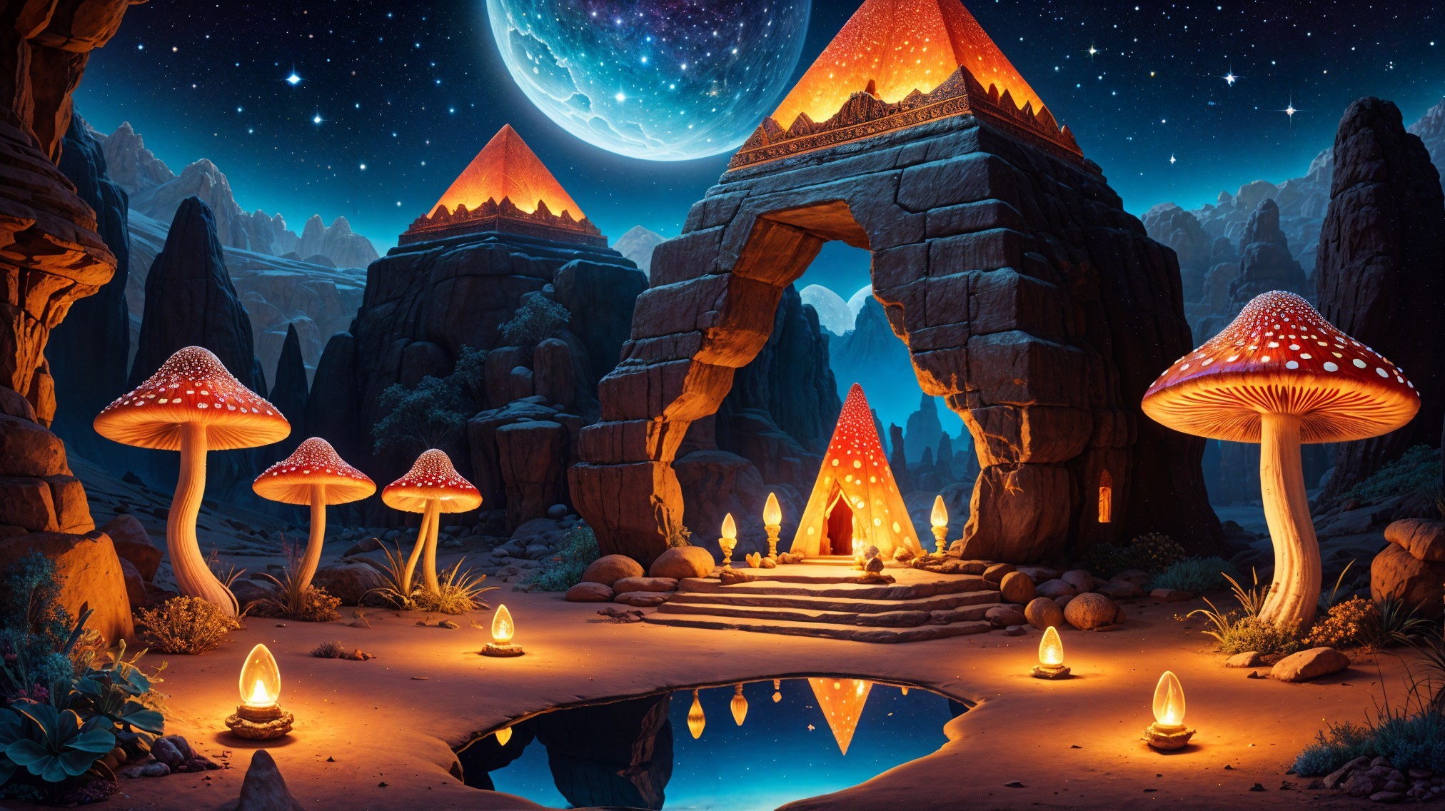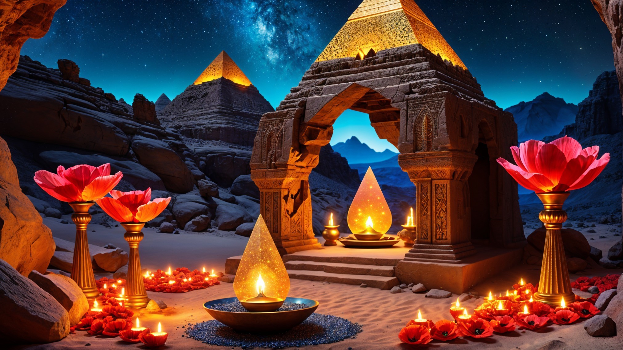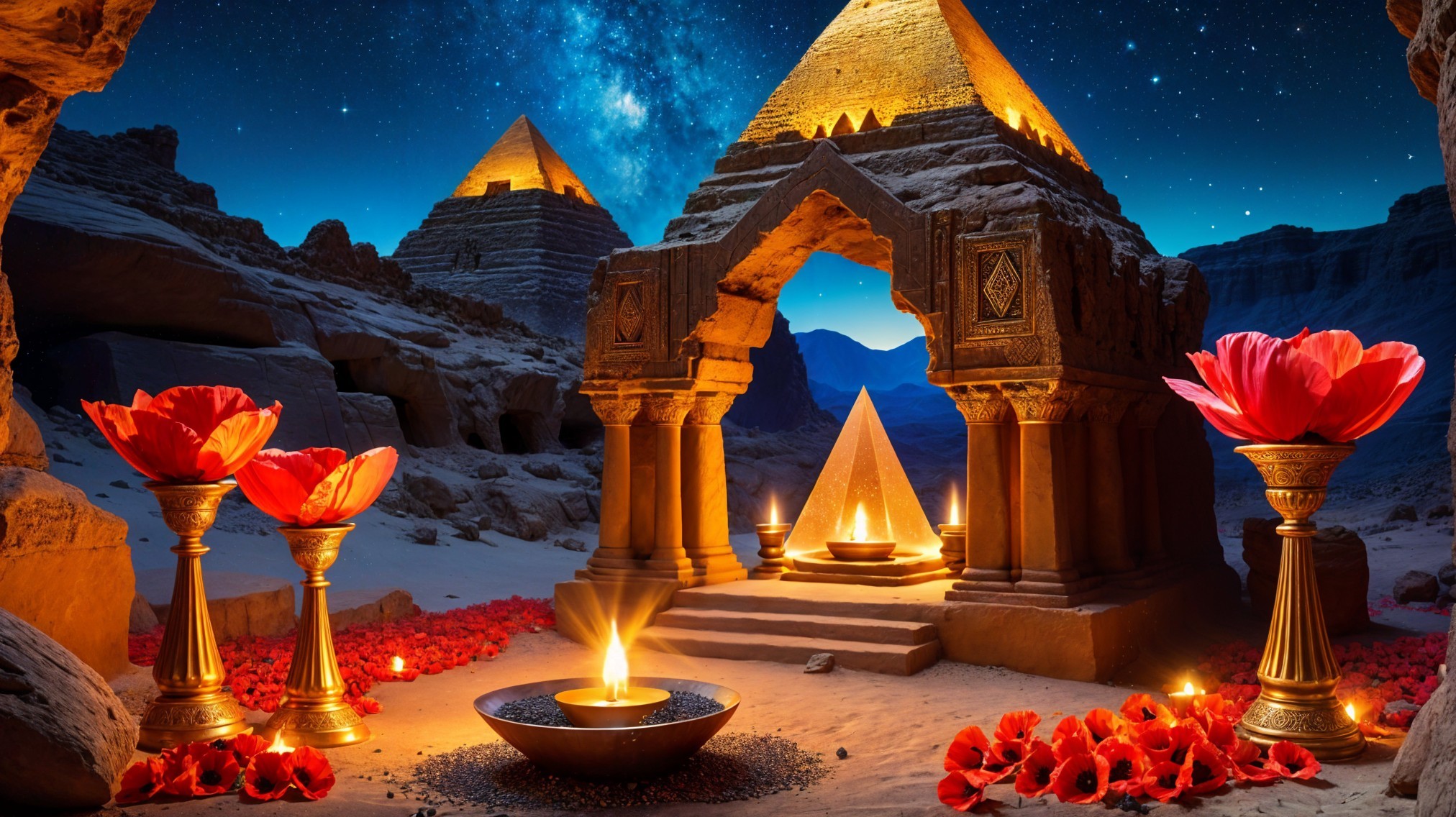 A mystical desert scene features glowing pyramids under a full moon, framed by an ornate archway. Vibrant poppies add color to the sandy landscape, enhancing the enchanting atmosphere.