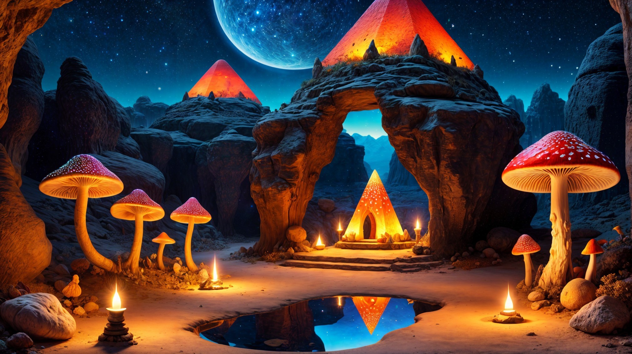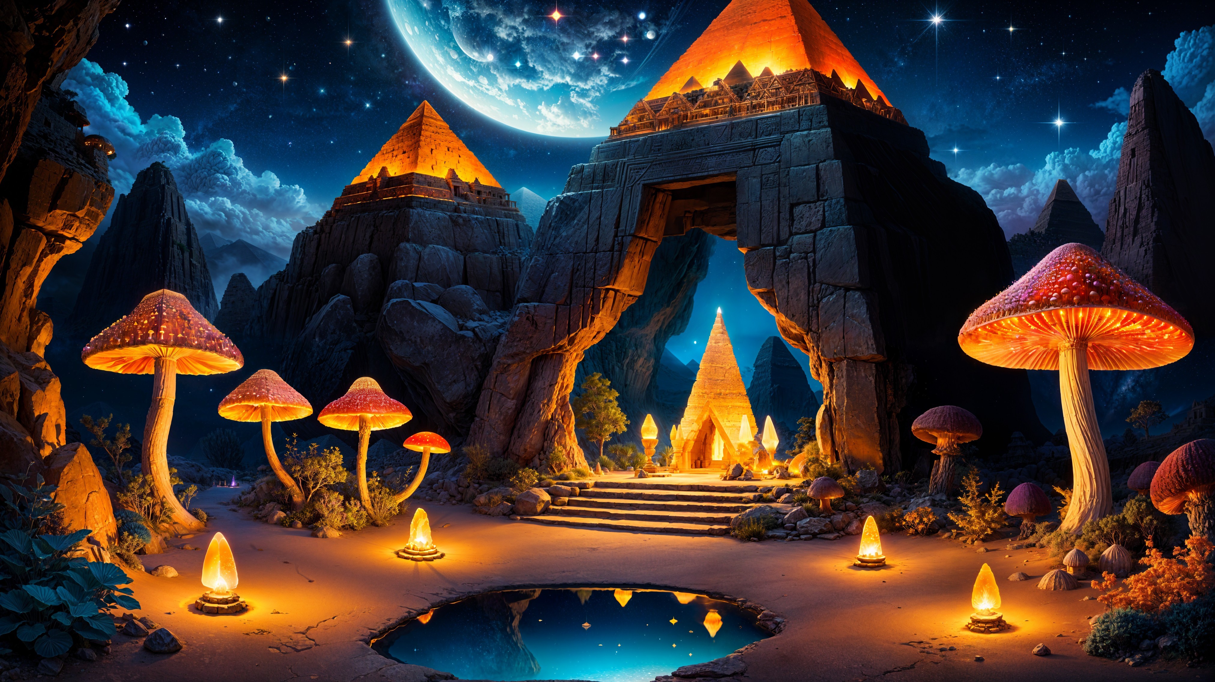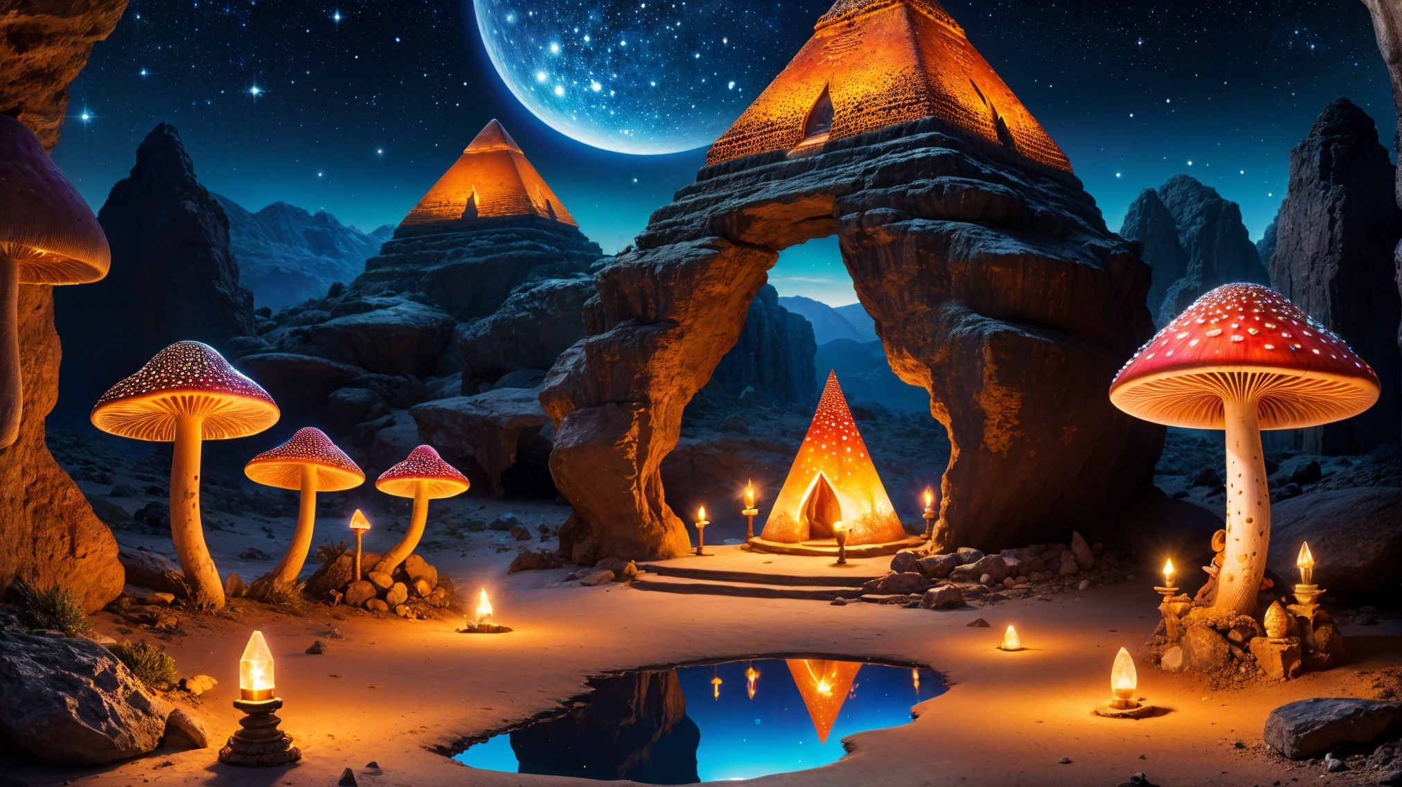 A mystical desert scene features glowing pyramids under a full moon, framed by an ornate archway. Vibrant poppies add color to the sandy landscape, enhancing the enchanting atmosphere.