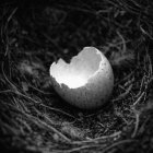 A black and white, close-up, high angle macro photograph of a half-broken bird egg inside a bird’s nest, taken in natural light with a shallow depth of field. The egg is speckled with dark grey dots, with rough and jagged edges along the top where it is broken.