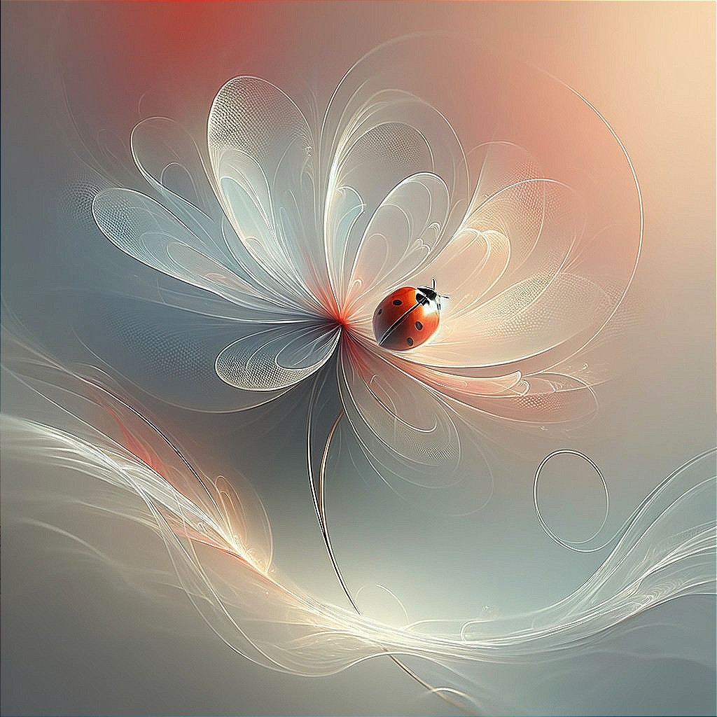 A ladybug on a delicate, abstract, swirling floral pattern with a soft gradient background of warm hues.