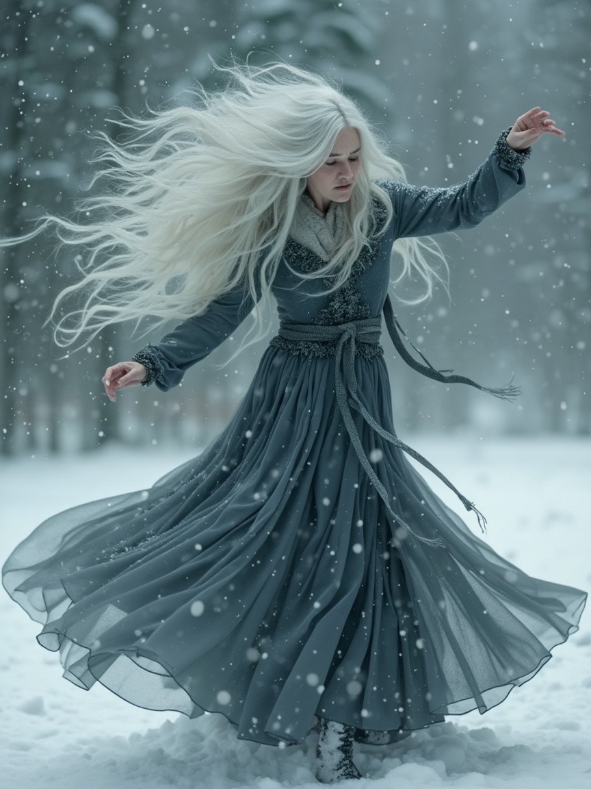 A woman with long, flowing silver hair twirls gracefully in a snowy landscape, wearing an elegant gray dress. Snowflakes gently fall around her, creating a serene winter atmosphere.
