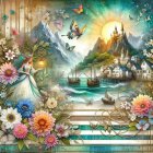 A whimsical scene features a graceful figure holding a glowing orb amidst vibrant flowers and butterflies. In the background, majestic mountains and a serene harbor with boats complete the enchanting landscape.