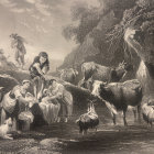 In a serene landscape, a woman washes laundry by a stream while a cow grazes nearby. A man tends to a cart, and children play among sheep, surrounded by majestic mountains and lush greenery.