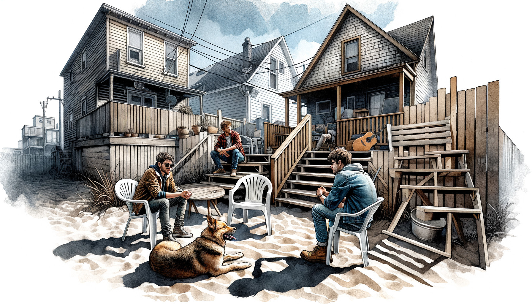 Prompt: "Create an image of a stylized, high-contrast, watercolour scene featuring three individuals and a dog in an outdoor urban backyard setting. The setting includes wooden structures such as clapboard siding homes with a rustic feel, a wooden deck with steps, and an improvised wooden barrier. The ground is a beach. Two individuals are seated on white plastic chairs; one individual is centered in the composition, possibly male, wearing casual clothing, and holding a guitar. The second individual is to the left, with long hair, potentially female, in a relaxed, contemplative pose, elbows on knees, and hands clasped. The third person is seated on the deck steps on the right side of the image, wearing a jacket and jeans, with indistinct features, facing away from the viewer. Finally, a medium-sized dog with a visible collar is lying on the ground by the deck, facing towards the back of the scene. Shadows are cast on the ground, suggesting that the main light source is coming from the front left side of the image. The overall effect is that of a casual, intimate backyard gathering captured in a graphic, inked art style."