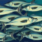 Prompt: "Picasso, Fuseli, Haeckel, Piranesi: school of sardines all swimming in the same direction; integrating typography, vintage prints, geometric patterns, double exposure, in rich blues, greens, violet, navy, teal, and black"