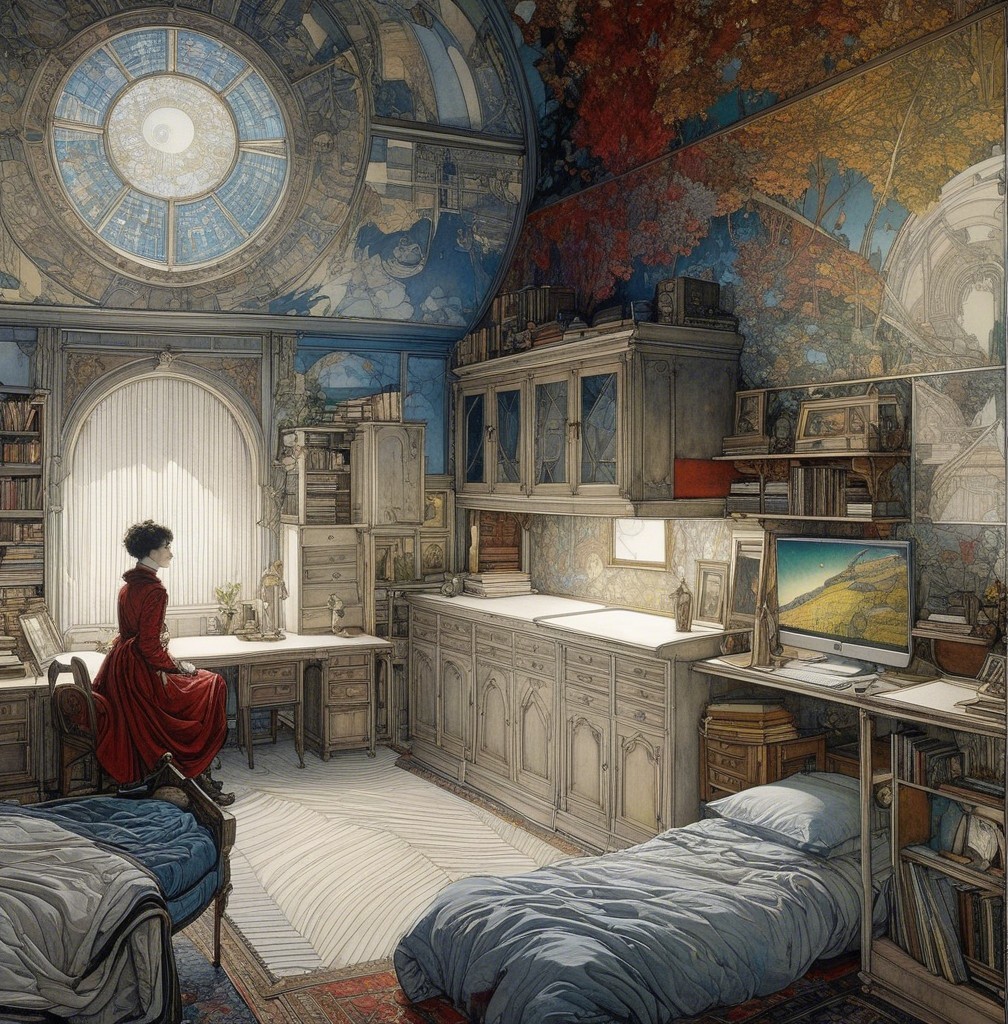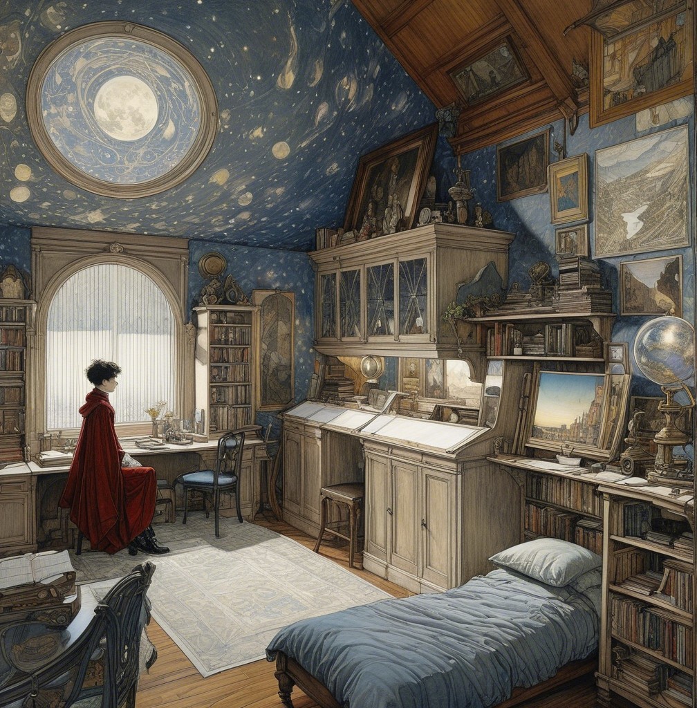 A cozy, elegantly designed room with wooden walls, adorned with paintings. A man in a red coat stands by a window, gazing at the artwork, while a bed and study area complete the setting.