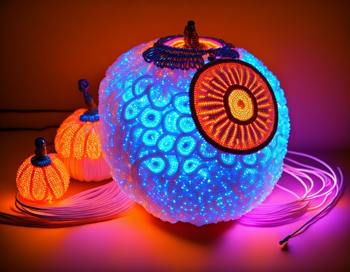 A glowing array of decorative pumpkins in vibrant colors, featuring blue and orange hues. Each pumpkin is illuminated with intricate patterns, creating a festive and enchanting atmosphere.