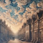 Prompt: A highly detailed digital illustration of an old European street at dawn, with tall Victorian-style brick houses lining both sides of a cobblestone road. A vintage carriage moves away in the distance, and a few figures dressed in early 20th-century clothing walk along the street. The sky is filled with swirling, textured clouds in golden and blue tones, reminiscent of Van Gogh’s brushstrokes. The lighting is warm and ethereal, creating a nostalgic and poetic atmosphere. The overall style is a mix of engraving and fine watercolor with intricate textures and luminous depth.