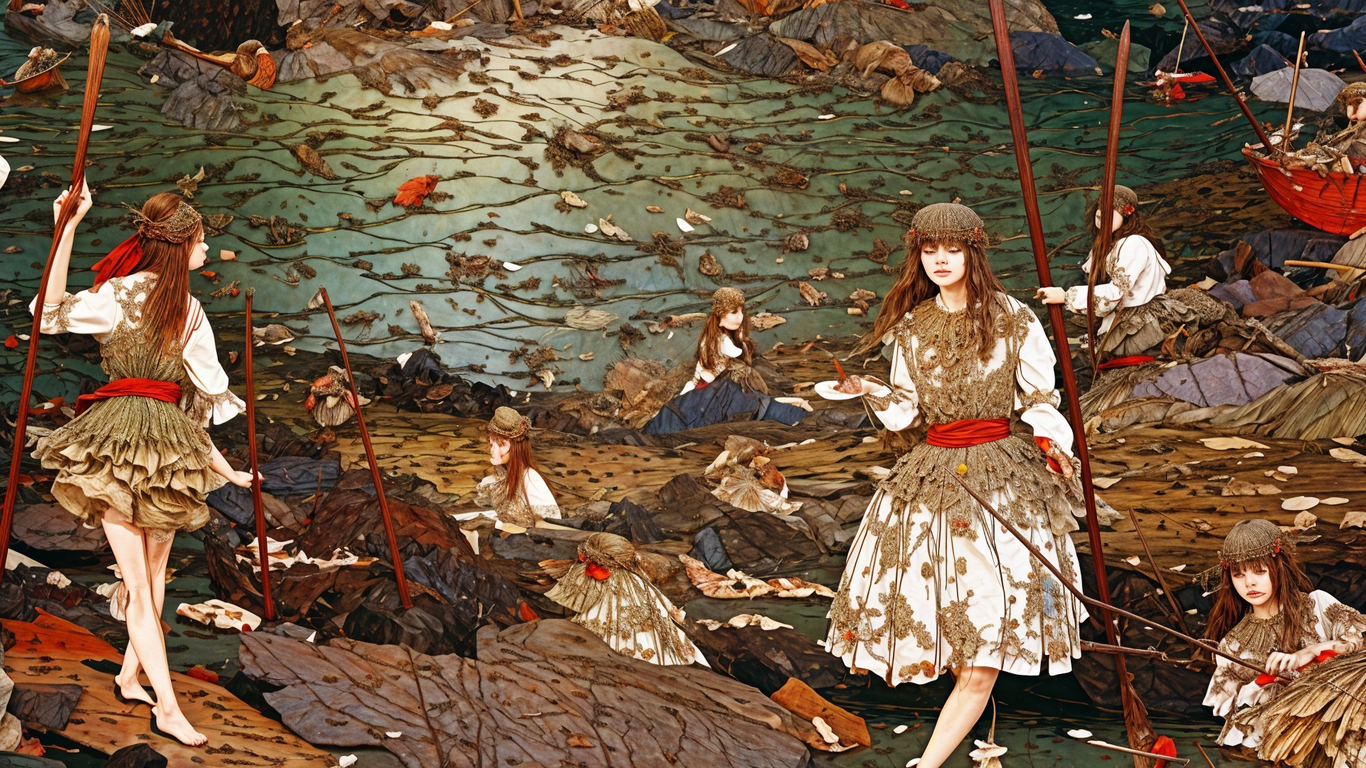 The image depicts a serene riverside scene with multiple women in elegant, nature-inspired dresses adorned with floral crowns, gracefully interacting and enjoying the tranquil surroundings. Note: This comes from a highly stylized painting by Richard Dadd, The Fairy Feller's Master Stroke. I find this version quite surprising.