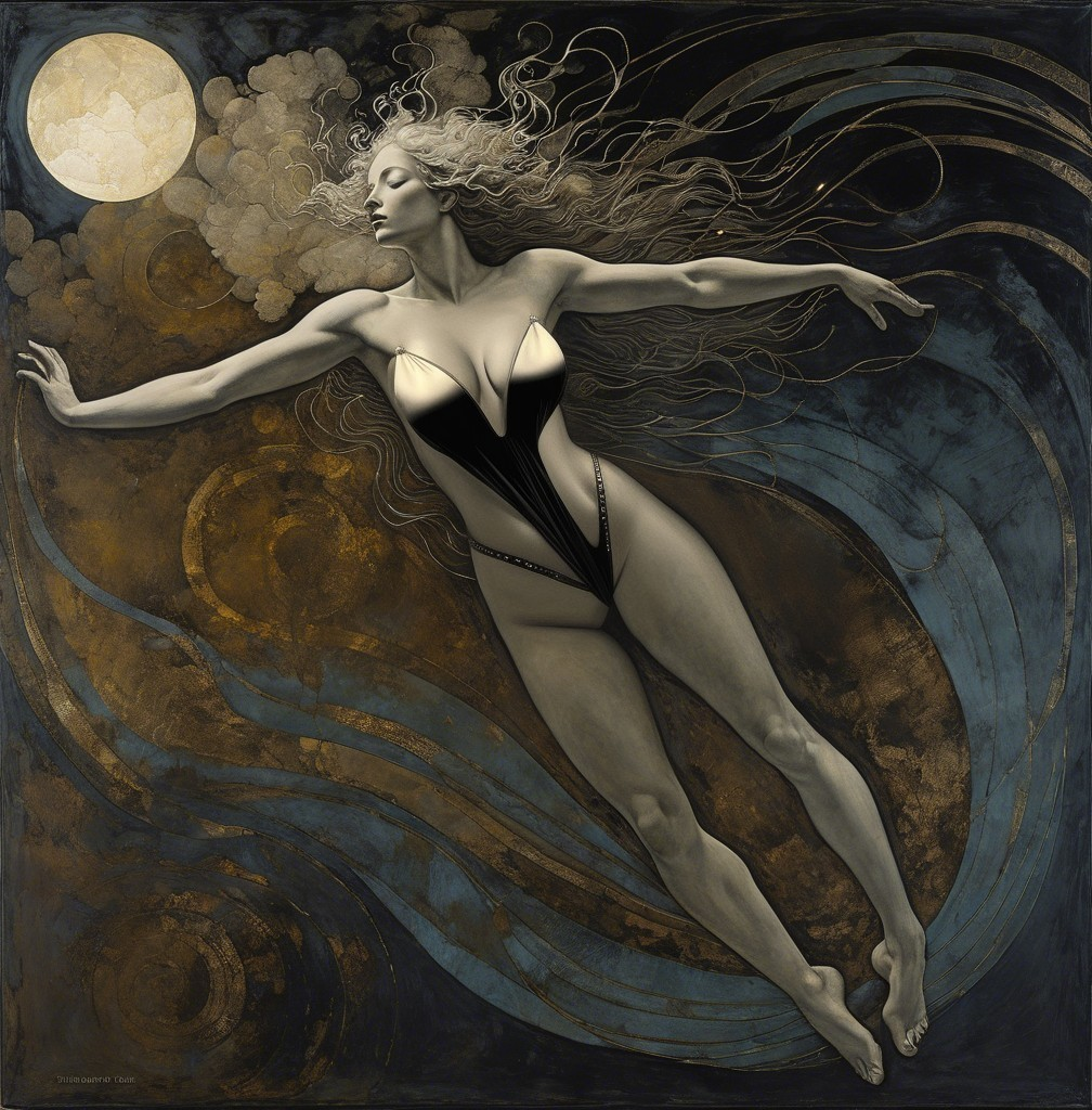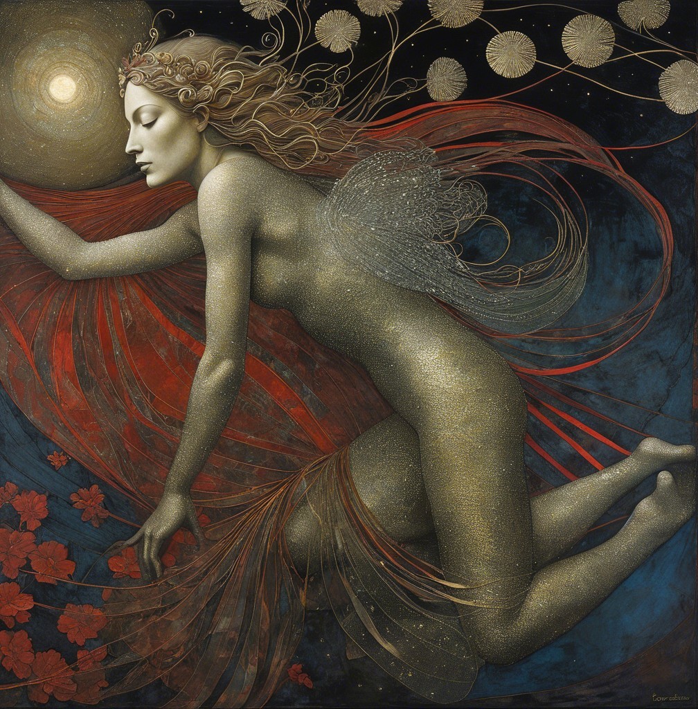 Surreal dream Tribal soul. In the darkness I dance, nostalgia, glory, Mercury Glass patina, light and gossamer haze, topographic lines, Art Brut, moody, somber, desaturated colors. In the style of John Rogers cox . This artwork amalgamates the artistic styles of Michael Parkes,