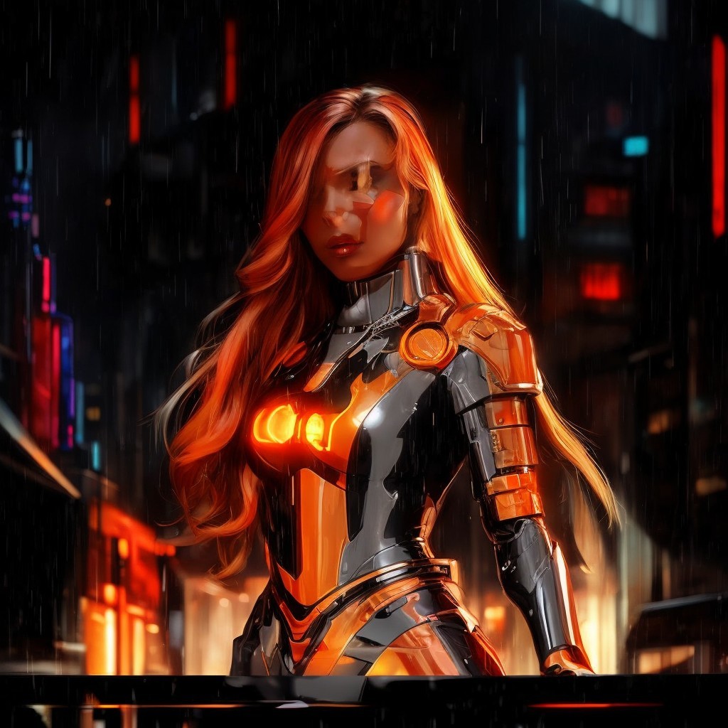 A futuristic woman with red hair and glowing cybernetic armor stands under rain in a neon-lit cyberpunk inspired cityscape. Orange and red lights highlight her long beautiful hair and shining armor. She is strikingly chivalrous despite her futuristic and dystopian environment.