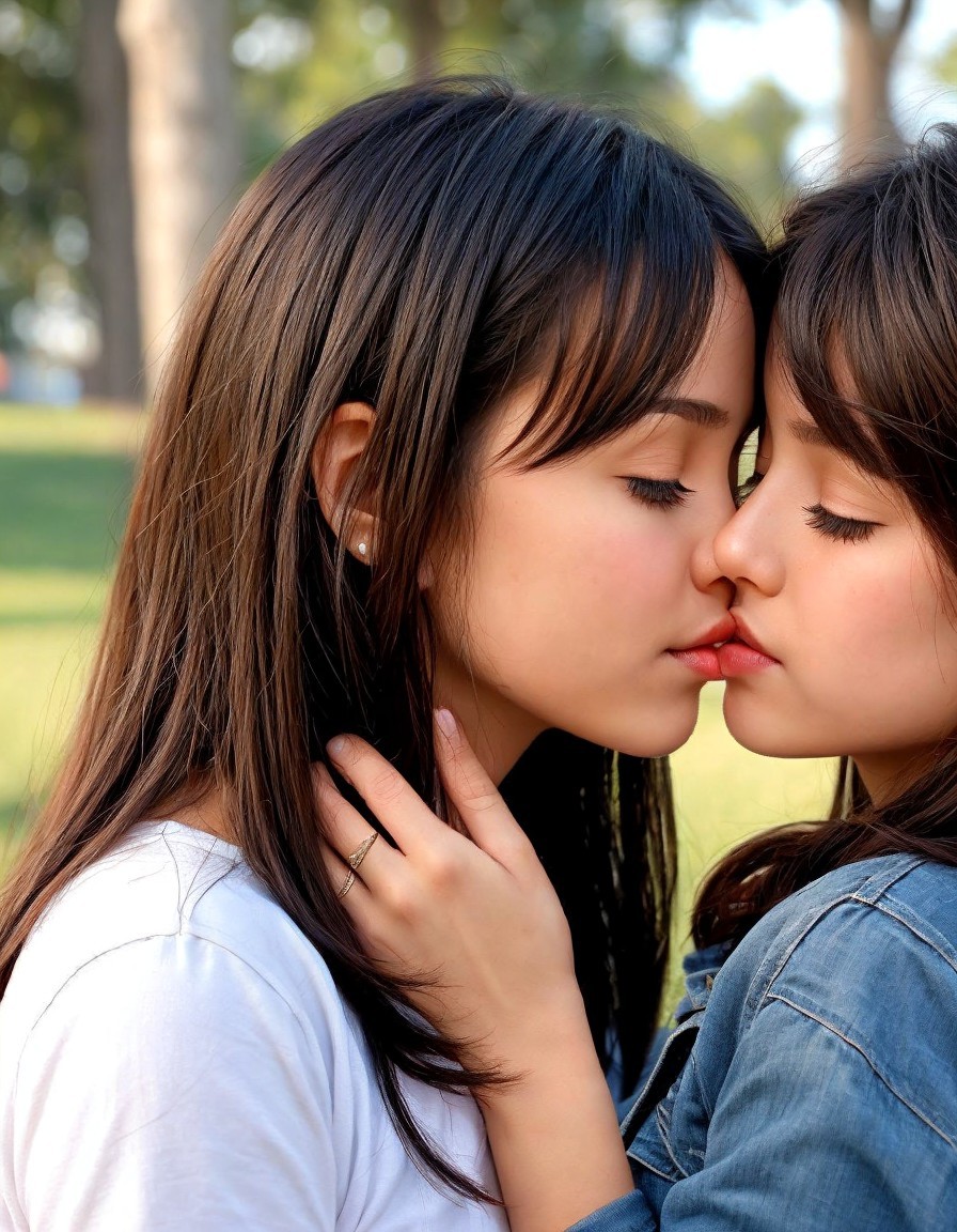 Two individuals are close together, seemingly sharing an intimate moment, with a soft-focused, natural background.
