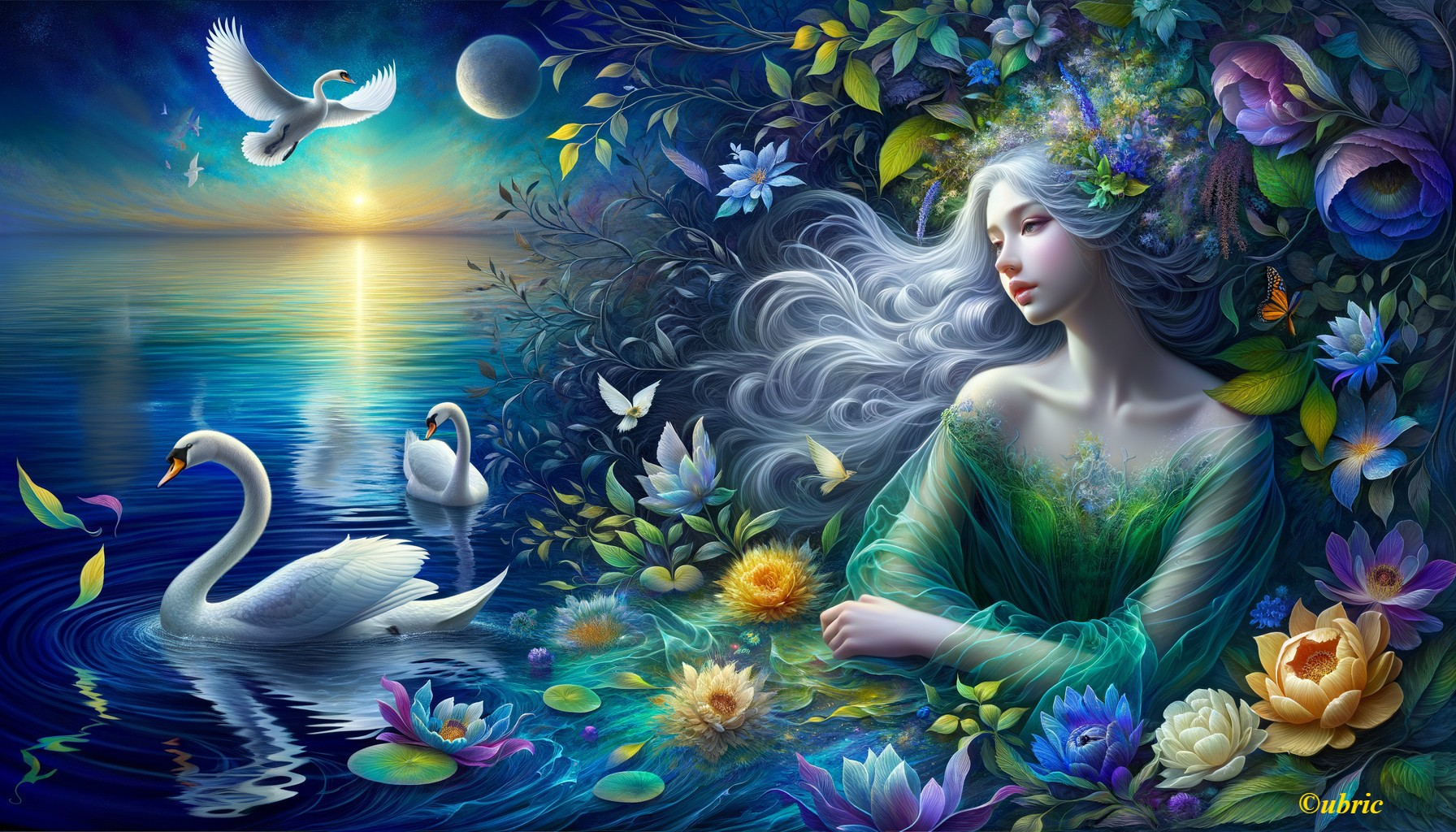 A mystical woman with flowing hair sits by a serene lake with swans, surrounded by vibrant flora and fauna under a moonlit sky.