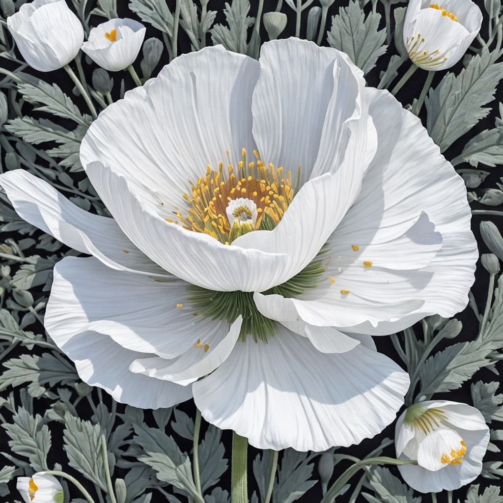 A close-up of a white poppy with a yellow center surrounded by green foliage and other poppies.