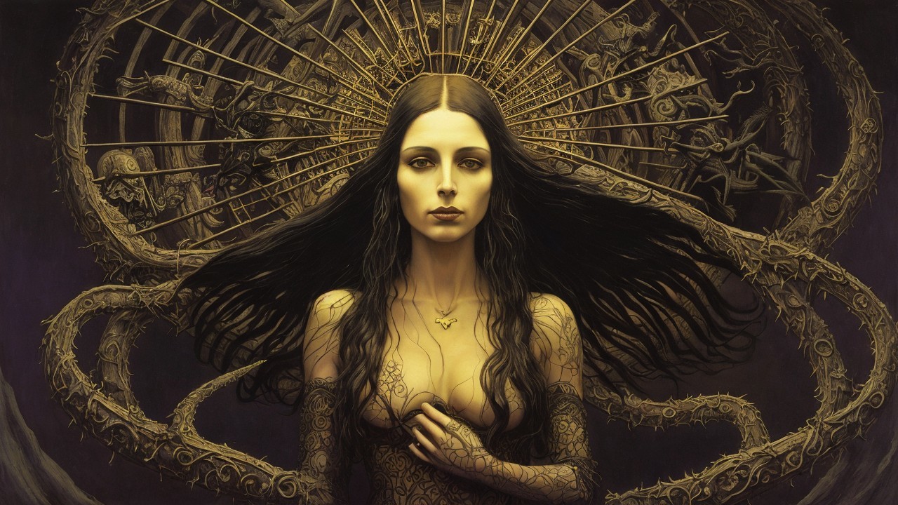 In the style of Sara Shakeel, Vivienne Westood, Felicien Rops, Boris Vallejo, William Blake, ((Zdislaw Beksinski)), Jakub Schikaneder, Georgia O'Keefe and Jacek Yerka.