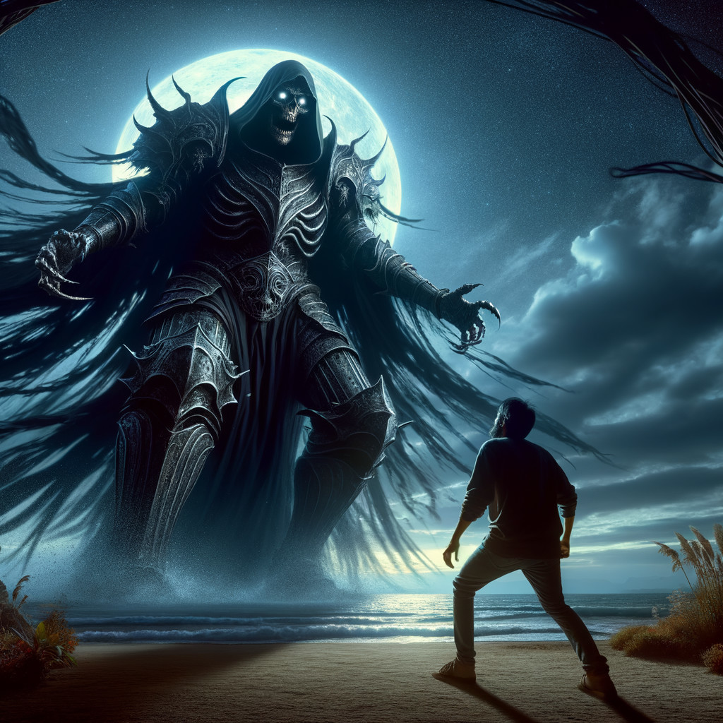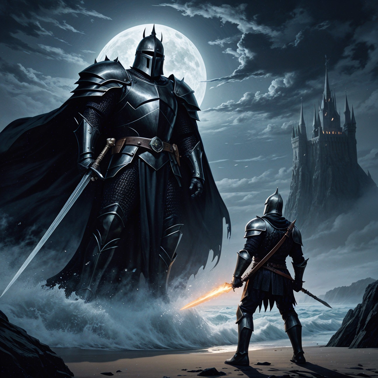 A towering black-armored knight stands against a backdrop of a full moon and ominous clouds, facing a smaller knight wielding a flaming sword, with a dark, gothic castle in the distance.