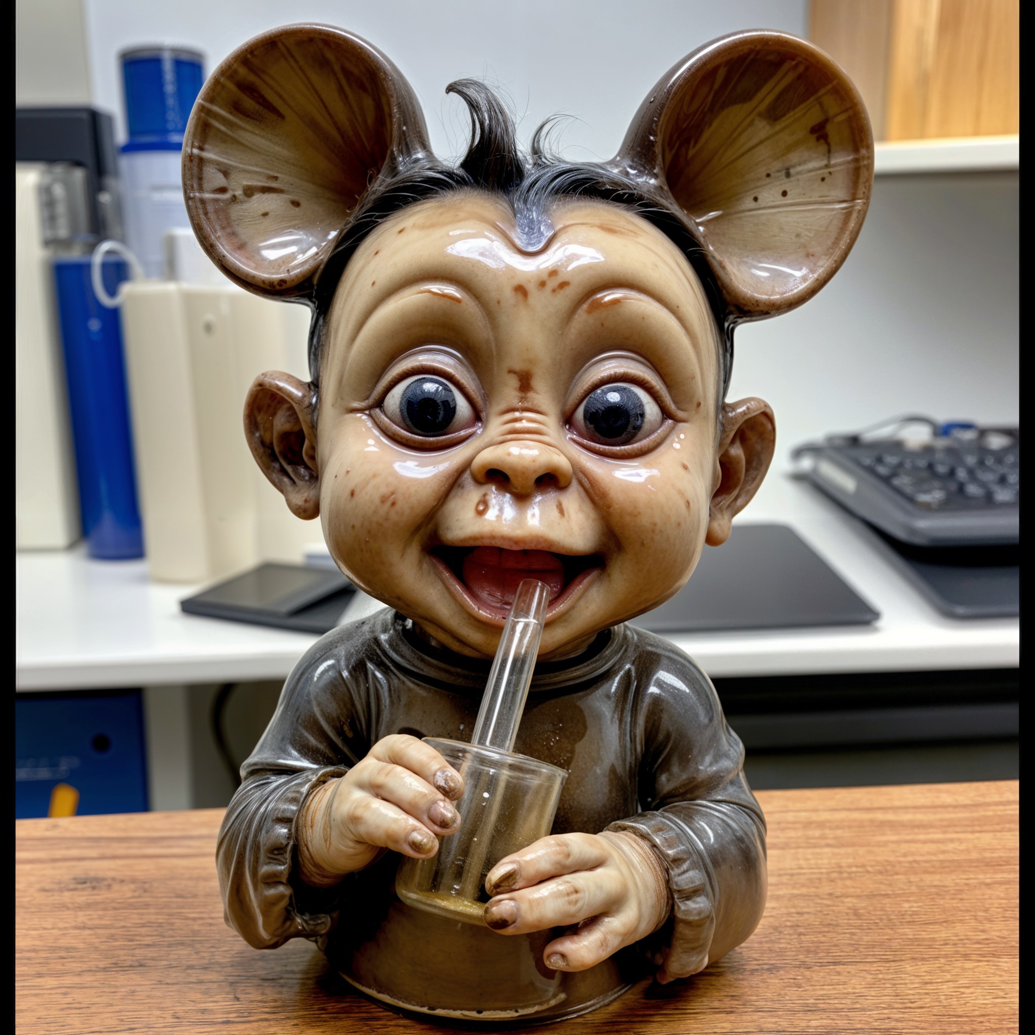 A large-eared, whimsical creature with a baby bottle, resembling a fantasy character or an artistic doll, is displayed with a detailed, life-like design.