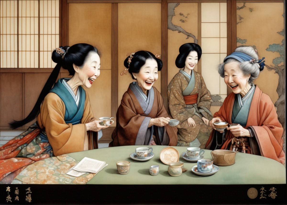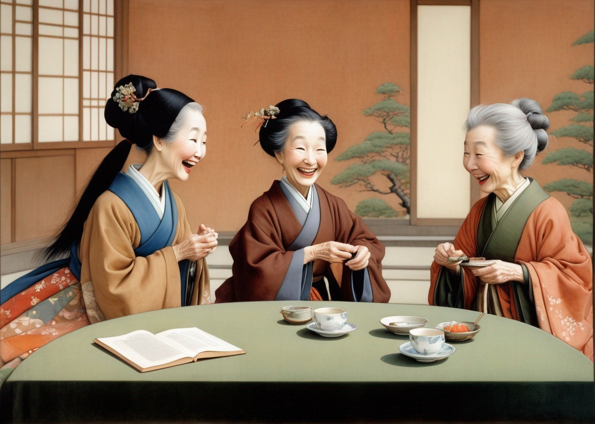 Three elderly women share a hearty laugh together at a table with a traditional Asian backdrop, conveying warmth and joy.