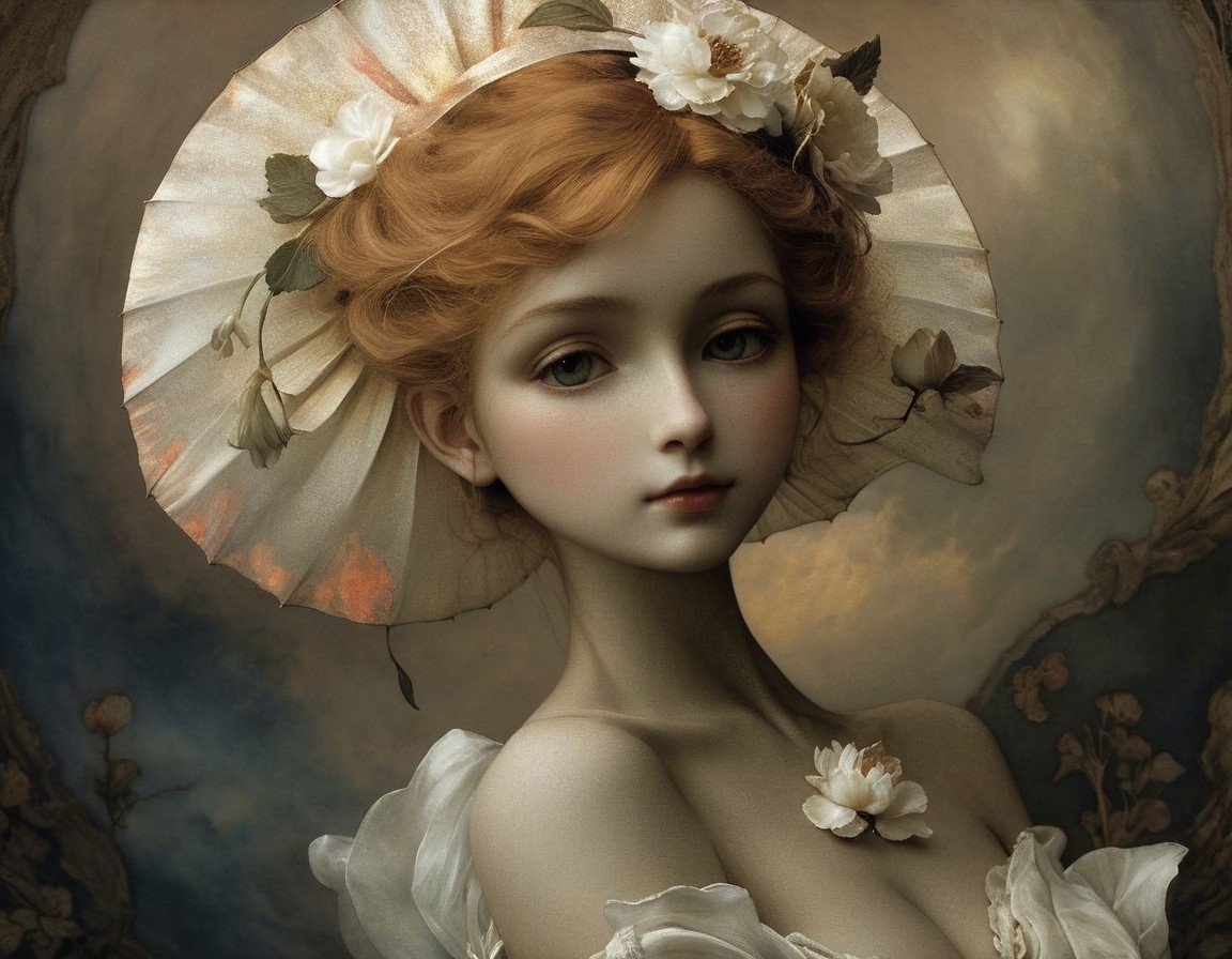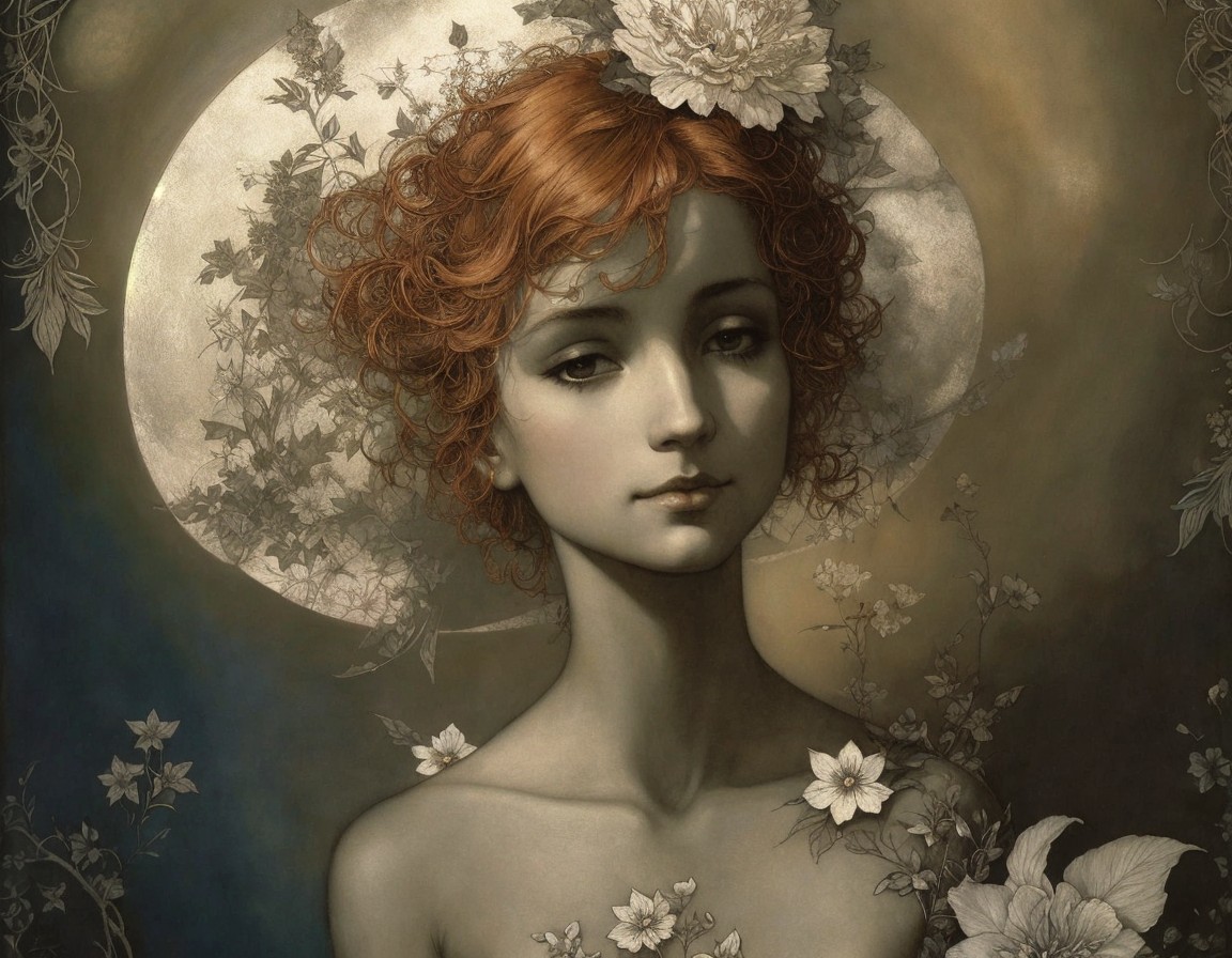 A serene portrait of a young woman with elegant, flowing hair adorned with flowers. She gazes thoughtfully, framed by a glowing moon, exuding a sense of ethereal beauty and tranquility.