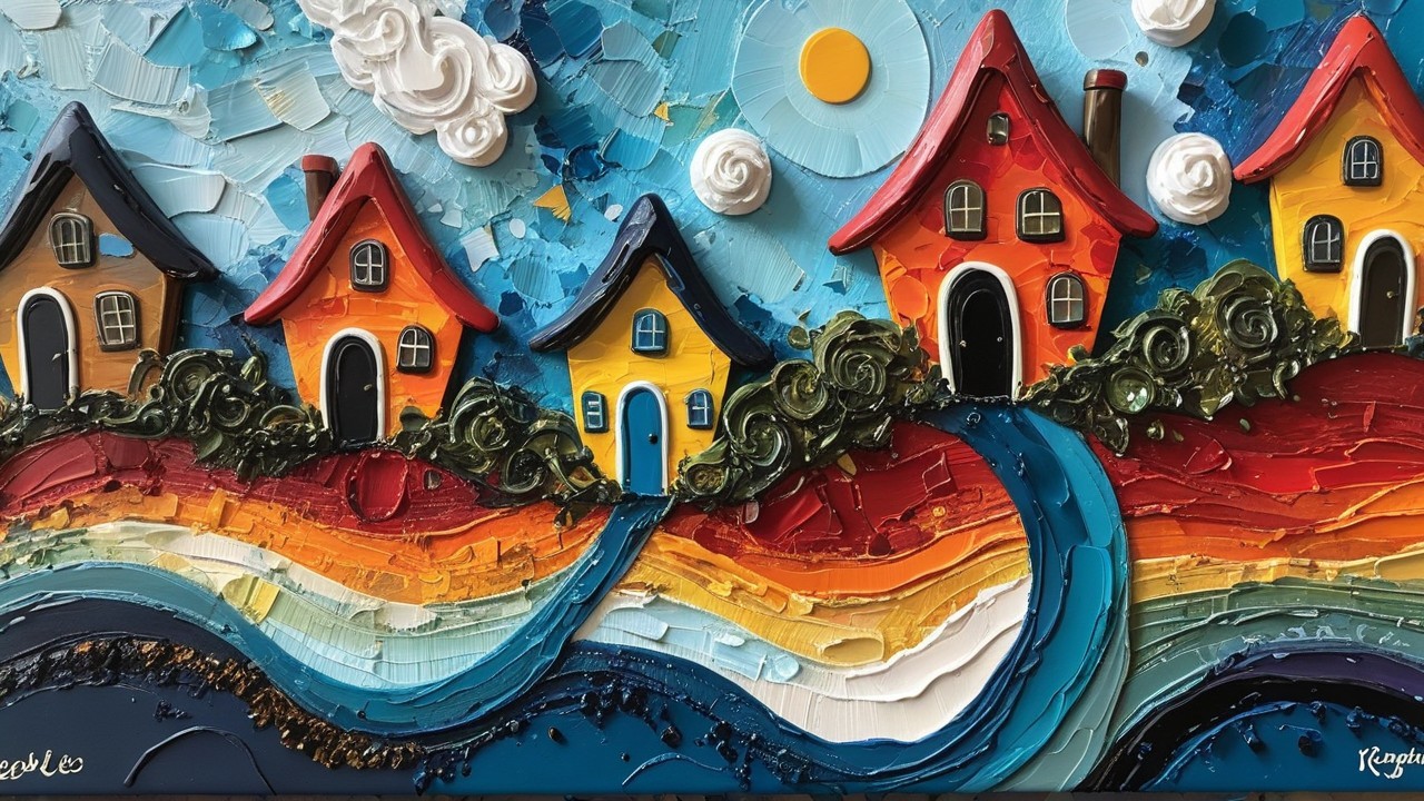 Prompt: "Create an abstract collage, full shot, composed of thick textured layers, mixed media Oil Painting in Impasto Style with glaze effect, drip art, splatter flowing art, clay and ink, showcasing coarse 3D texture of palette knife painting, shimmering reflections contrast shadows, and a dreamy atmosphere, A enigmatic mystic ethereal image in insane reality of curly flexible unusual houses , flowers are intertwined penetrate of a beautiful aristocratic. we see the double exposure on her sesapeal face with long flowing red brown hair and the city backdrop, in sudactive see-trough attire city backdrop, 3/4 profile view, sumptuous glow cloud fabrics, detailed embroidery, moody chiaroscuro lighting, contrast hues, high-resolution, perfect composition, artstation concept, dramatic vibe.. kieth henning brush oil on canvas gold,orange,light magenta and white minimalist female fashion model zen lines hachura glow lines abstract brushstroke art, sharp step gradient, optical illusion effect . The artwork combines cross-hatching and double exposure, creating an absurd and grotesque scene with unique perspectives and optical illusion 3d space, sharp shadows create volume composition . Use different sizes of brushstrokes and highlights, contrast shadows, step gradient hues penumbras and reflections. deep colors, wet on wet, small bold strokes, sharp drople fractal paint oulines. 8k, intricate mystical composition, artstation concept"
