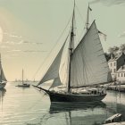 A serene coastal scene features sailboats gently floating on calm waters beneath a large sun. Quaint houses line the shore, complementing the tranquil atmosphere with soft pastel colors.