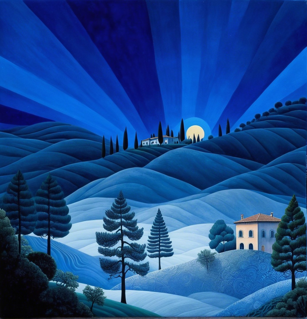 A serene landscape features rolling hills in deep blue hues, tall trees, and two houses under a moonlit sky, creating a tranquil and dreamy atmosphere. The art captures a peaceful night.