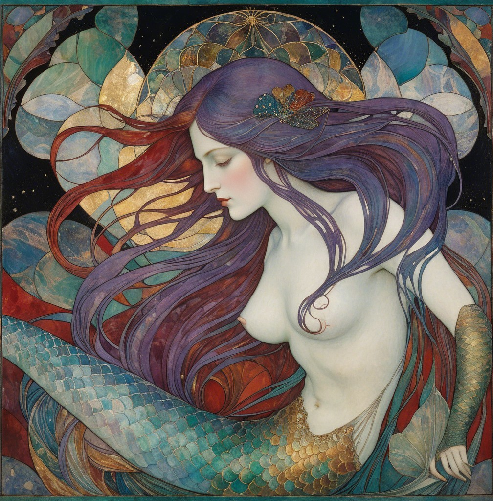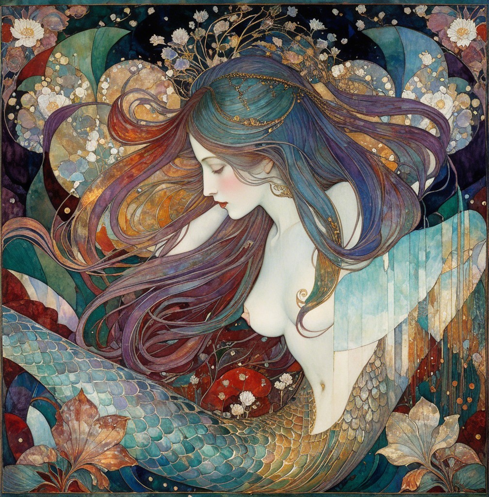 A beautifully ethereal mermaid with flowing, colorful hair and shimmering scales gazes serenely. Her flowing gown complements the mystical underwater backdrop, evoking a sense of enchanting beauty.