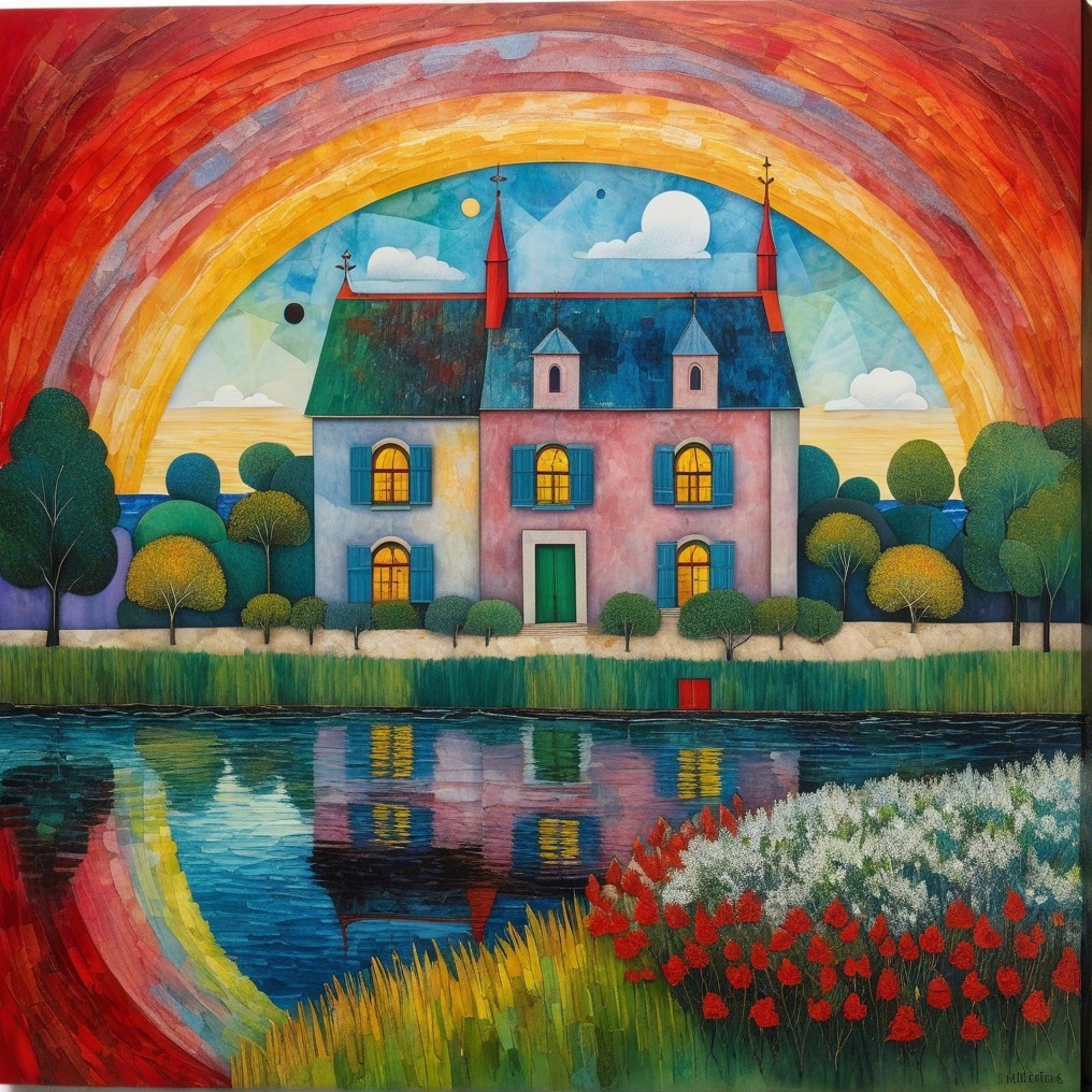 A vibrant, colorful landscape featuring a whimsical house with pointed rooftops beside a serene lake. A rainbow arches above, with lush trees and blooming flowers enhancing the charm.