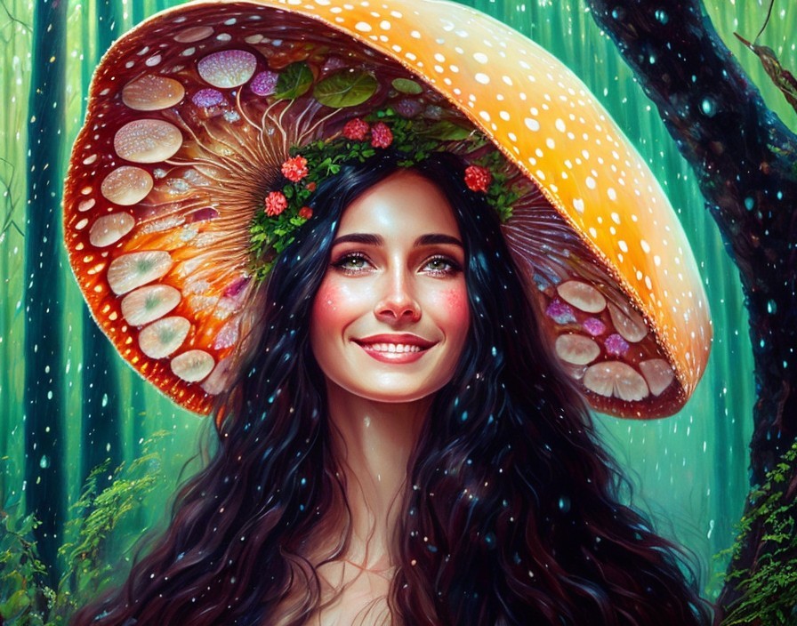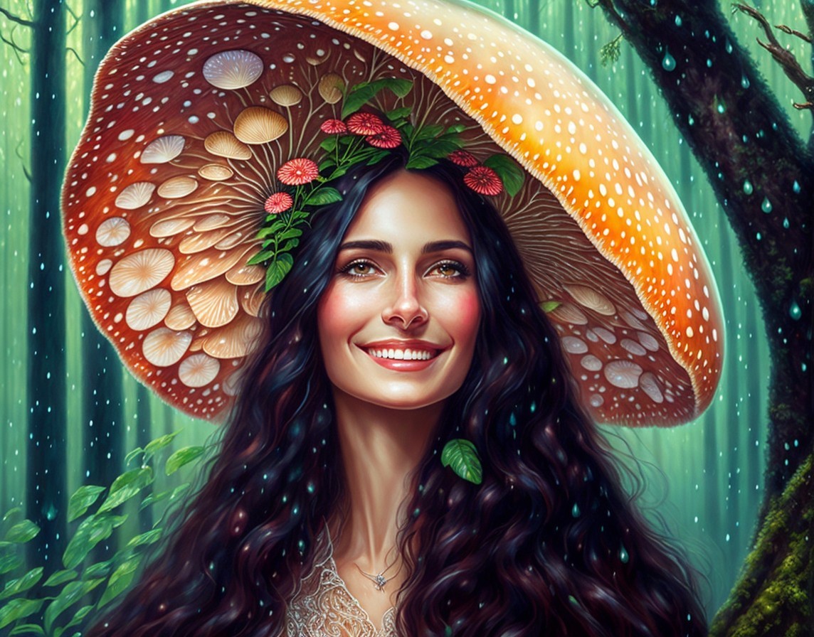 A digital artwork of a woman with a large mushroom cap as a hat, surrounded by a forest setting, exuding a whimsical vibe.