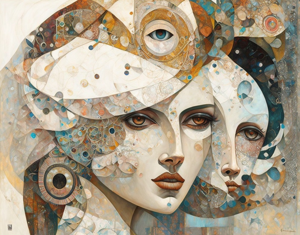 A stylized painting of two women with intricate headdresses and captivating eyes, adorned with elegant jewelry and mosaic details.