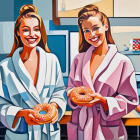 Two smiling women in bathrobes hold colorful donuts in a bright, modern kitchen. The scene is vibrant and playful, with a cheerful atmosphere and stylish decor.