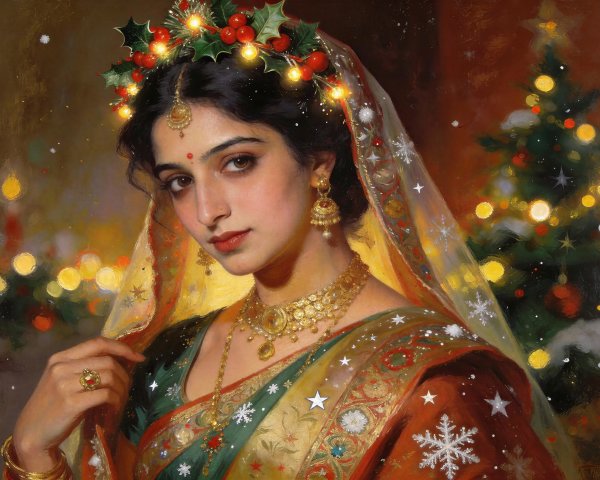 A young woman in a regal medieval dress, featuring blue and red colors, stands in a dimly lit stone castle. Her long, wavy hair is adorned with a crown, and she gazes thoughtfully.