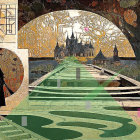 + Prompt:A stunning lady stands on a small bridge over a swampy river, medium shot, in a surreal collage and cubist fragmentation style, with deep, inky shadows of an eclipse. Crimson and ochre wildflowers bloom vibrantly, with golden light catching her hair. Masterpiece, art by c215, Arthur Rackham, Paul Barson, and Paul Lovering, watercolor painting, intricate details, artistic composition, dramatic lighting, red sunrise, cosmic mystery.. semi-abstract psychedelic Impressionistic painting, palette knife style, much paint, much too much paint. paint splatter.