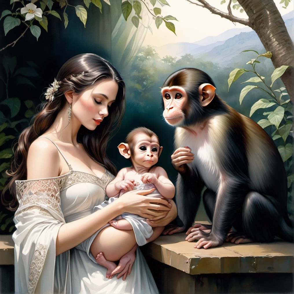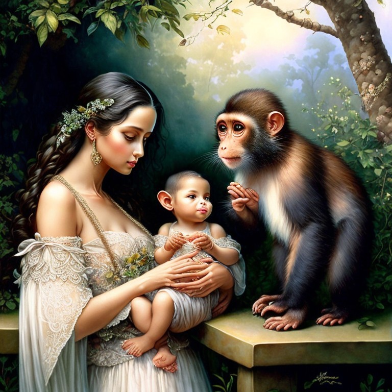 A woman holding a baby sits beside a monkey amid a verdant landscape with a lake in the distance.