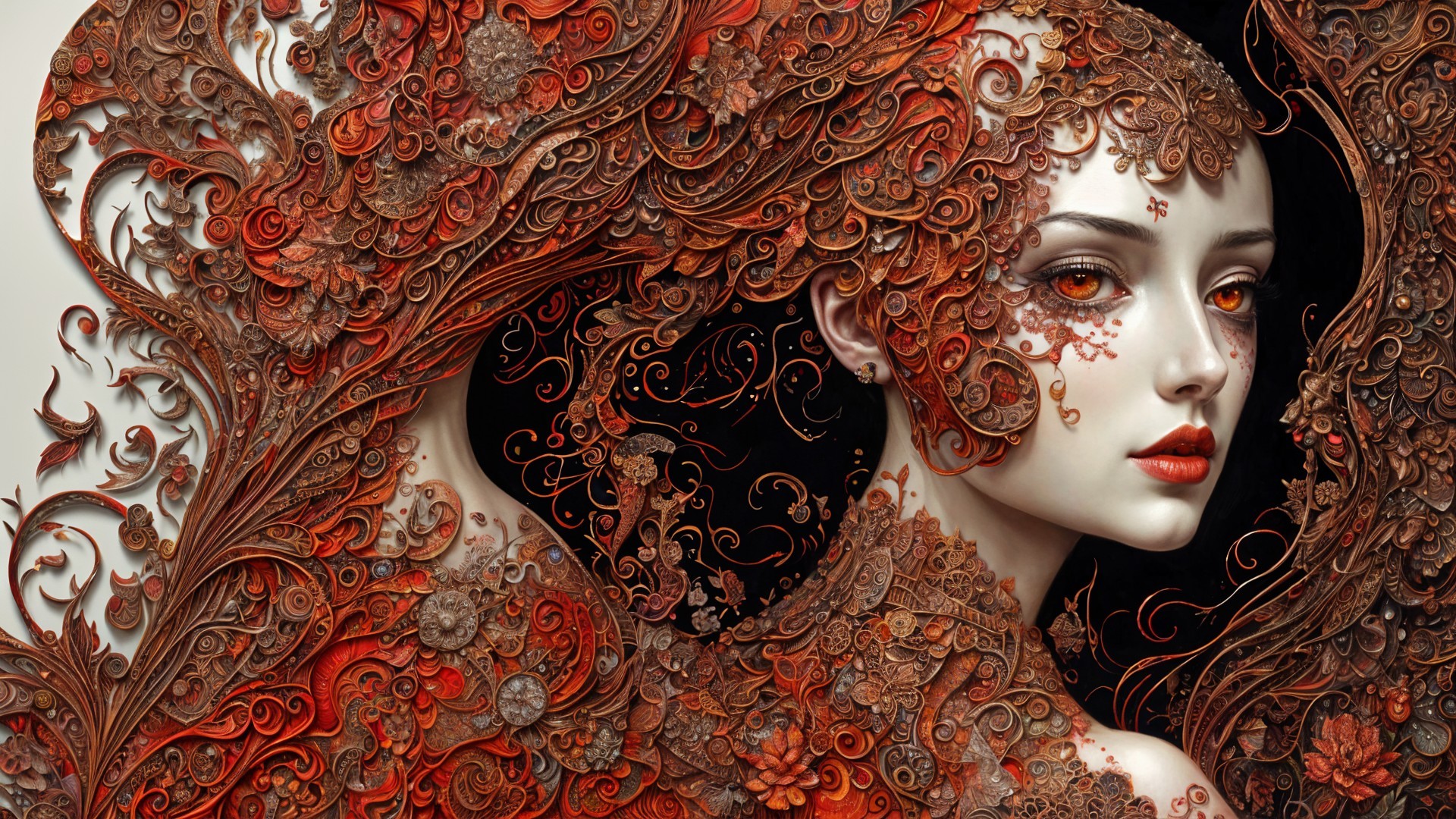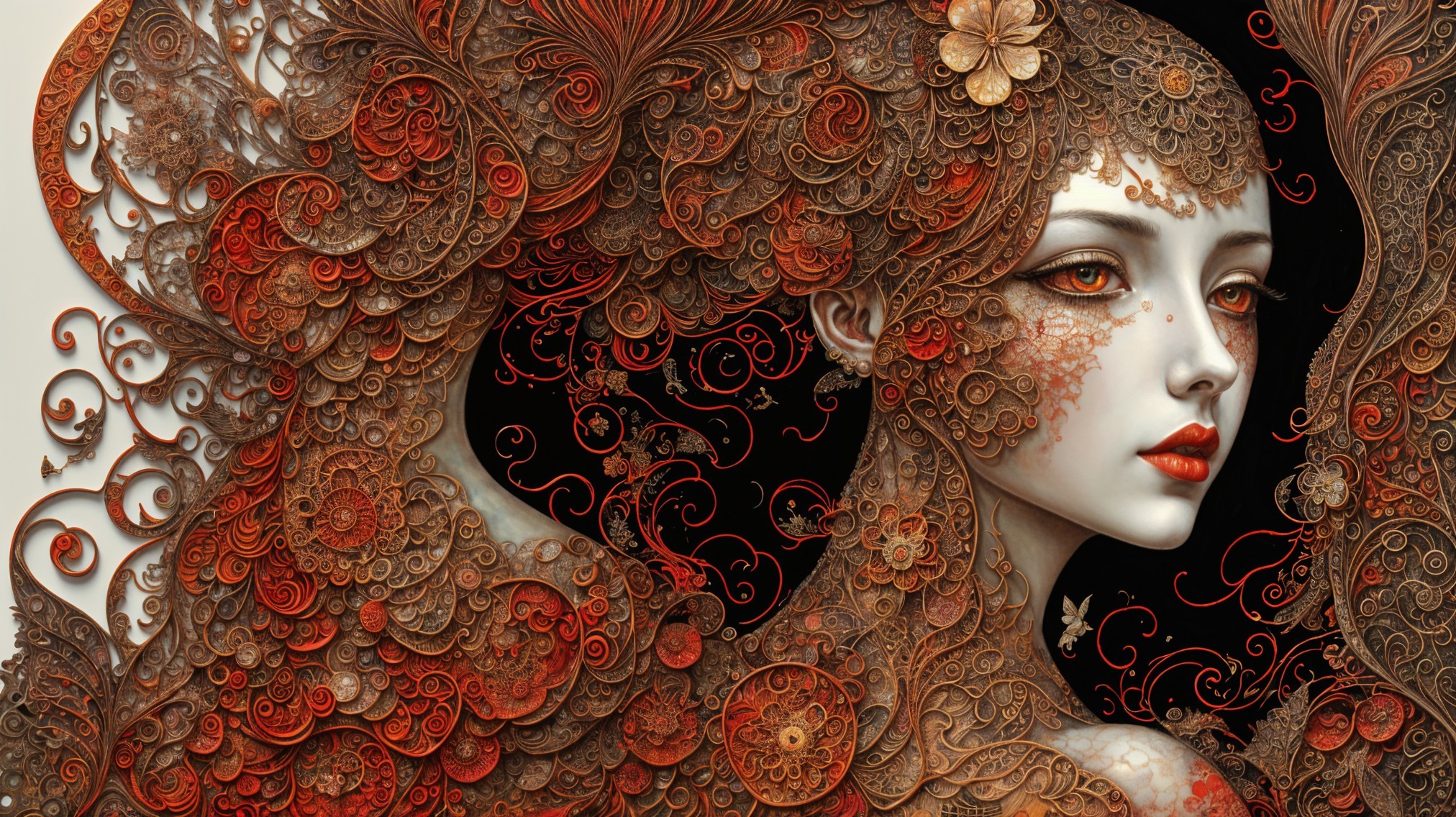 The image features a woman with intricate hair styled in ornate, swirling patterns. Rich reds and golds dominate, with floral and lace-like details enhancing the mythical, artistic aura.