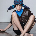 A young man sits on a sandy beach, wearing a star-patterned outfit and a sparkly blue headpiece. The moon is visible in the background, adding a mystical ambiance to the scene.
