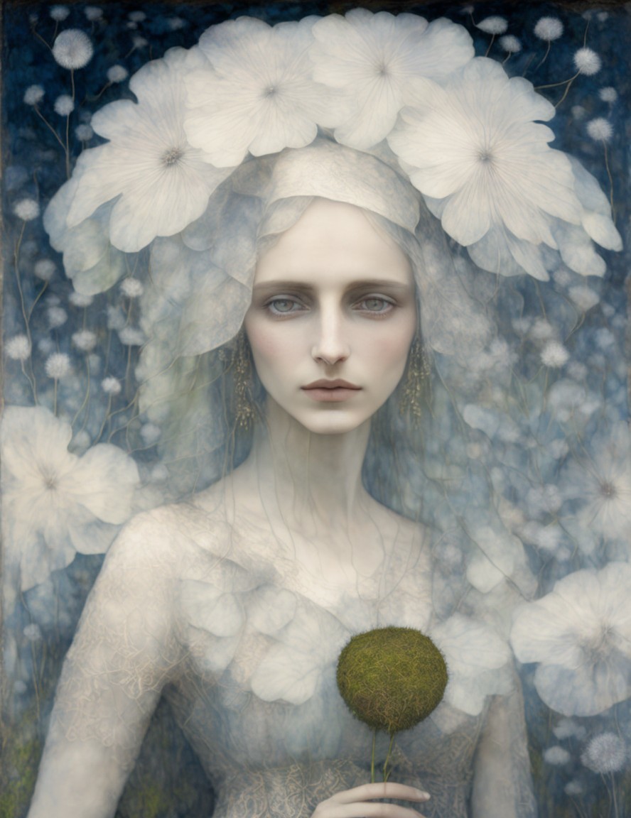Beautiful woman with a dandelion hat, portrait in sienna, patina of ancient stone with moss, art brut, moody, somber, desaturated colors, in the style of Paul Klee, Arthur Rackham